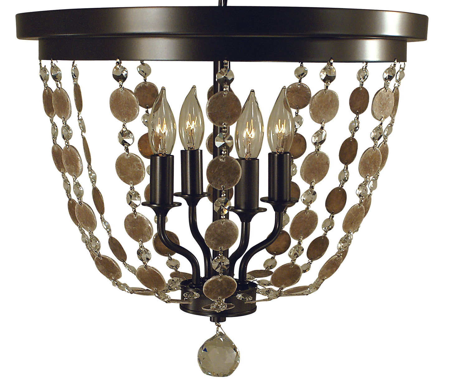 4-Light Mahogany Brass Naomi Flush Mount. Strands of crystal and mica are casually draped from the frames to diffuse the light and create both warmth and glitter. Every Framburg lighting product is manufactured in the USA.