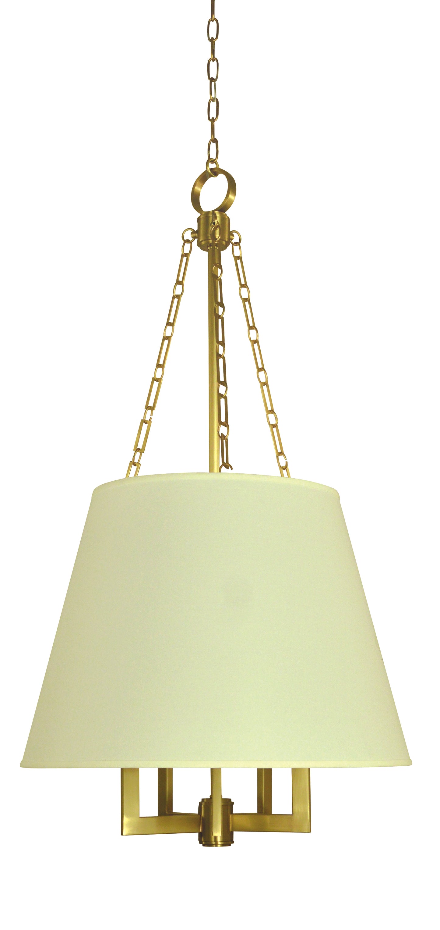 5-Light Brushed Brass Bistro Dining Chandelier. Off white hardback shade, decorative square chain.