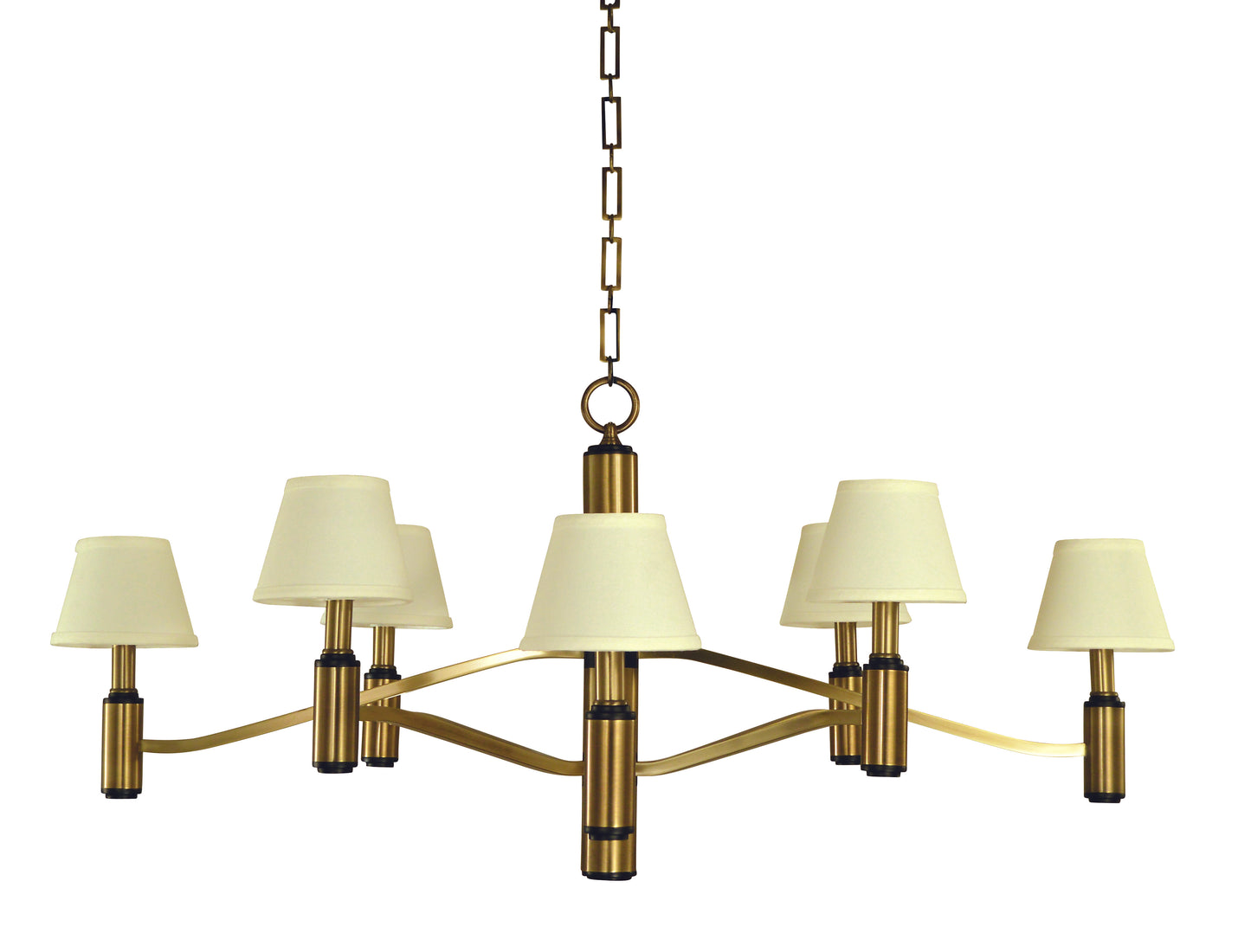 8-Light Antique Brass Matte Black Accents Hampton Dining Chandelier. Stately square tubing gently hand bent with a hardback off-white shade.