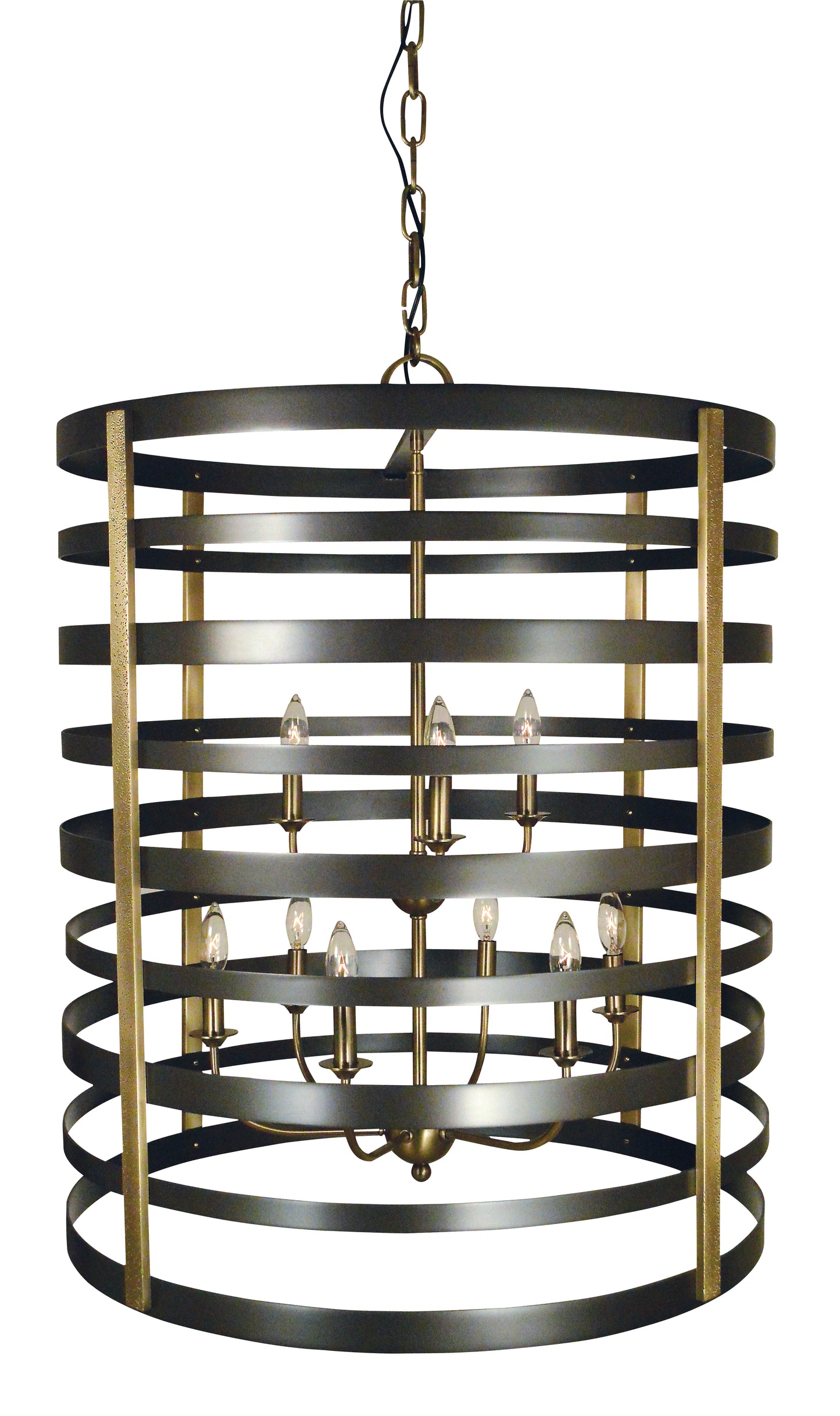 9-Light Pastoral Foyer Chandelier. Varying ring widths and hammered brass supports give an urban farmhouse feel to this design. Made in the USA.