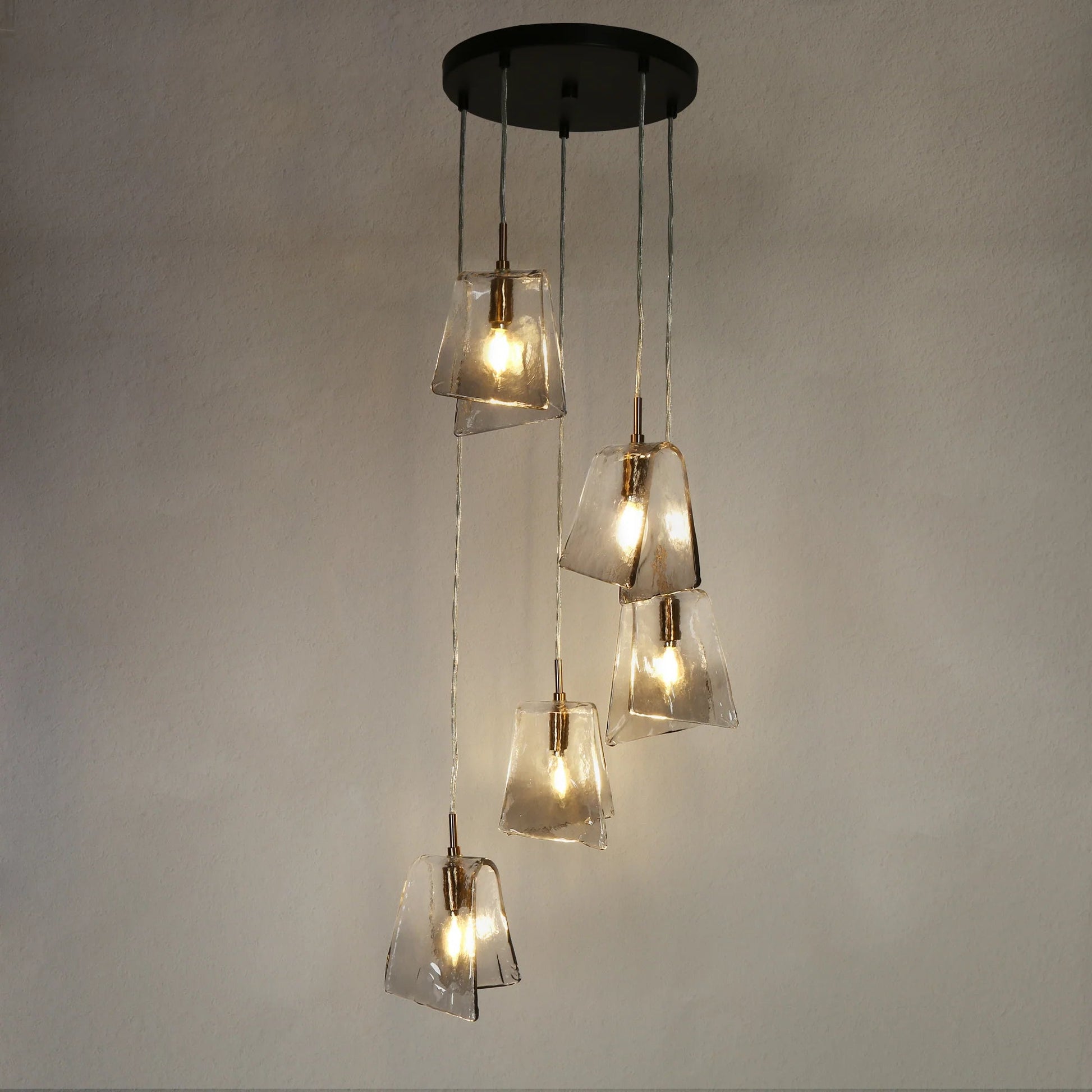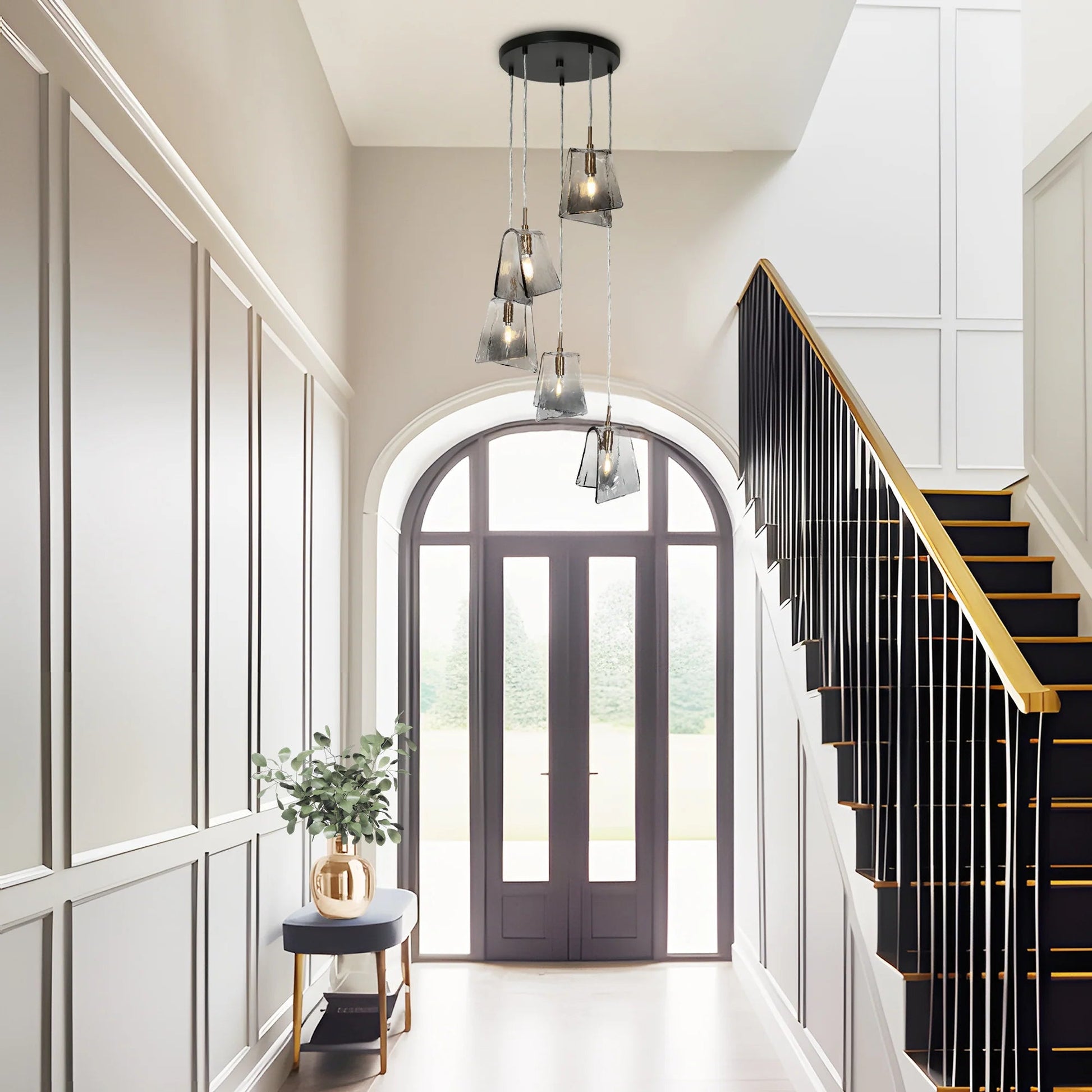 Featuring a round matte black ceiling plate, clear pendant wire, and gradient smoky gray irregular glass shade, this chandelier combines luxury with contemporary style.