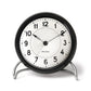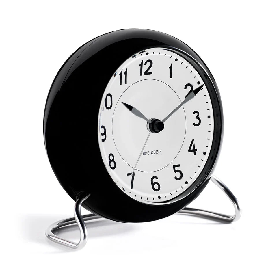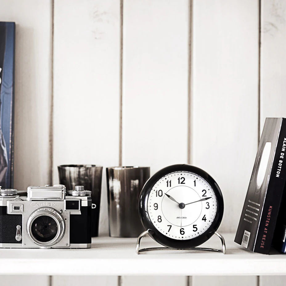 The Station alarm clock was designed for H.J. Hansen, manager of Lauritz Knudsen, who saw potential in Arne Jacobsen as a young architect in 1939. Comprised of a black case and white face in a glossy hard PE body, curved crystal, and stainless steel feet, the clock is a welcome addition to a nightstand or desk. It's unobtrusive, making it an excellent choice for a variety of interior spaces. A timeless classic, the alarm clock includes special IC alarm and a LED light.