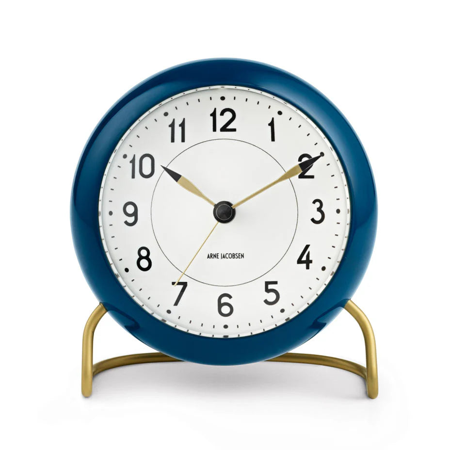 The Station alarm clock was designed for H.J. Hansen, manager of Lauritz Knudsen, who saw potential in Arne Jacobsen as a young architect in 1939. Comprised of a black case and white face in a glossy hard PE body, curved crystal, and stainless steel feet, the clock is a welcome addition to a nightstand or desk. It's unobtrusive, making it an excellent choice for a variety of interior spaces. A timeless classic, the alarm clock includes special IC alarm and a LED light.