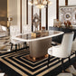 Diamond tufting and soft velvet fabric adorn the enticing Larissa Chair. A cream velvet covers the seat and back, elevated by diamond tufted stitching to create a visual smorgasbord of style. Brown velvet piping lines the edges while a contrasting textured fabric panel creates visual interest and contrast. Sleek black gloss legs end in gold caps to create a luxurious finish.