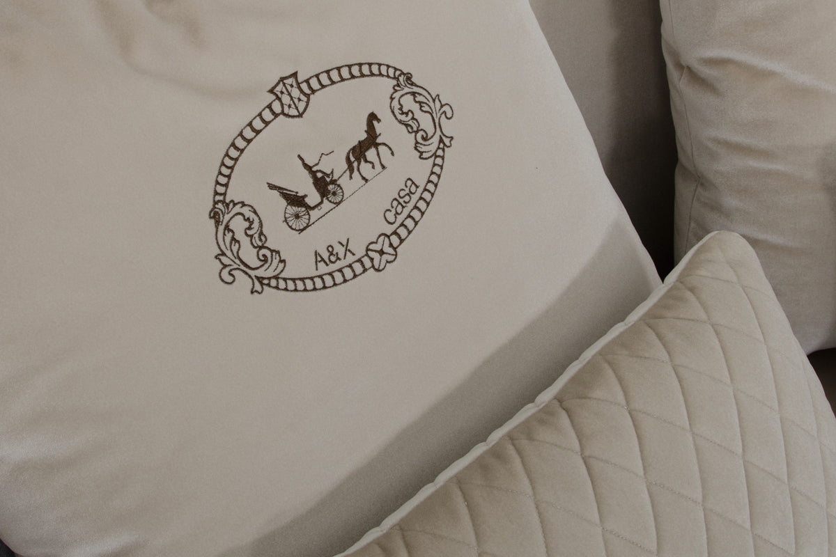 The horseshoe silhouette of the Talin Sofa Set is highly innovative. Pairing traditional diamond stitching with a contemporary beige velvet, this set stands out. Brown piping finishes the seams of these gorgeous pieces, creating glamour and contrast. Pair with other Talin pieces to complete a fully realized room.