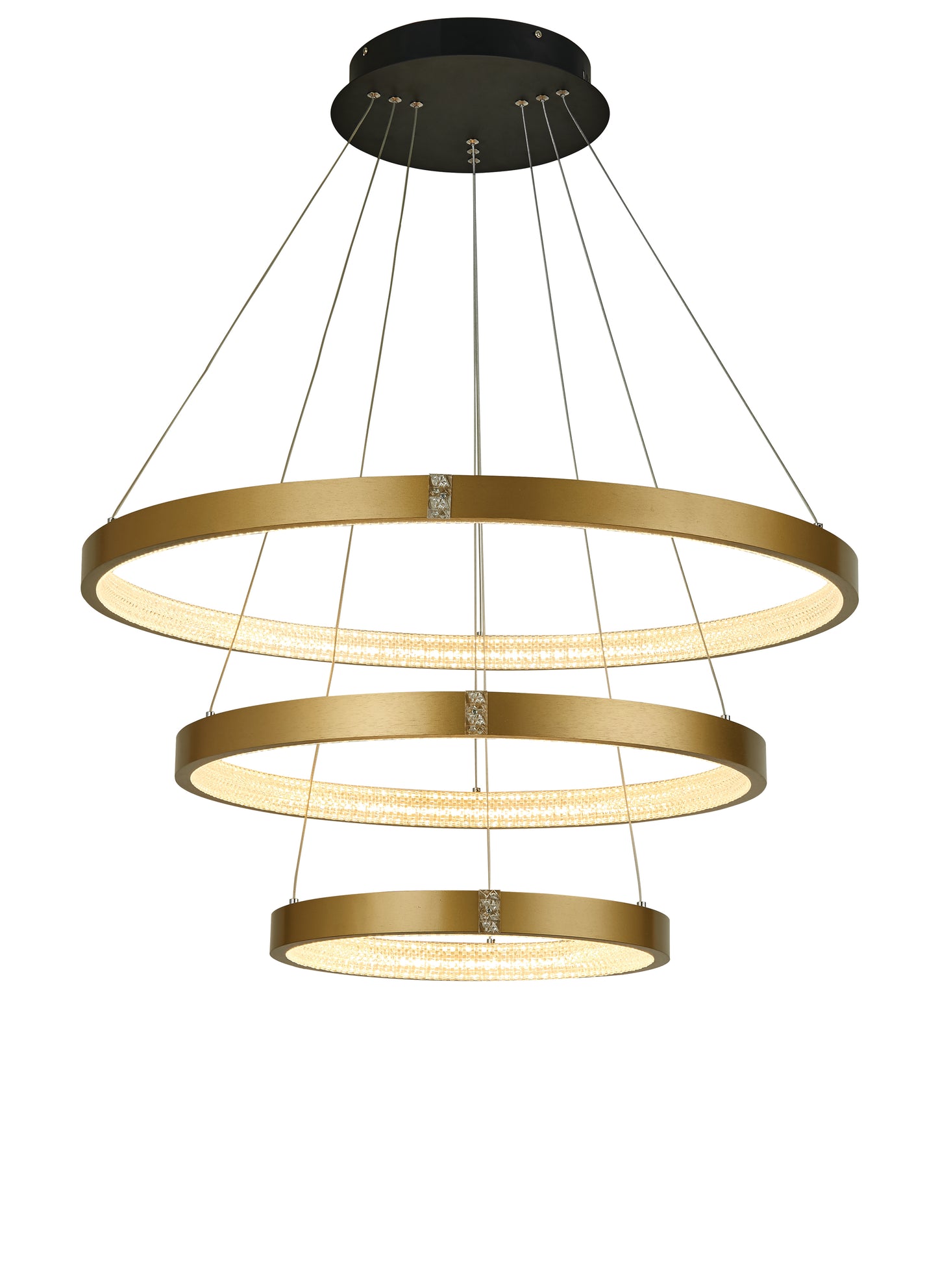 Brushed Gold Kinsley Foyer Chandelier. Kinsley collection in Brushed Gold illuminates with faux crystal accents, 3 tiers. 110W LED, 3000K integrated bulbs 80+ CRI, 9900 Lumens. Adjustable heights upon installation, dimmable with Triac dimmers. 5 year warranty.