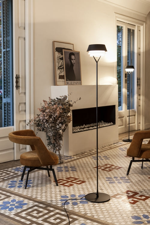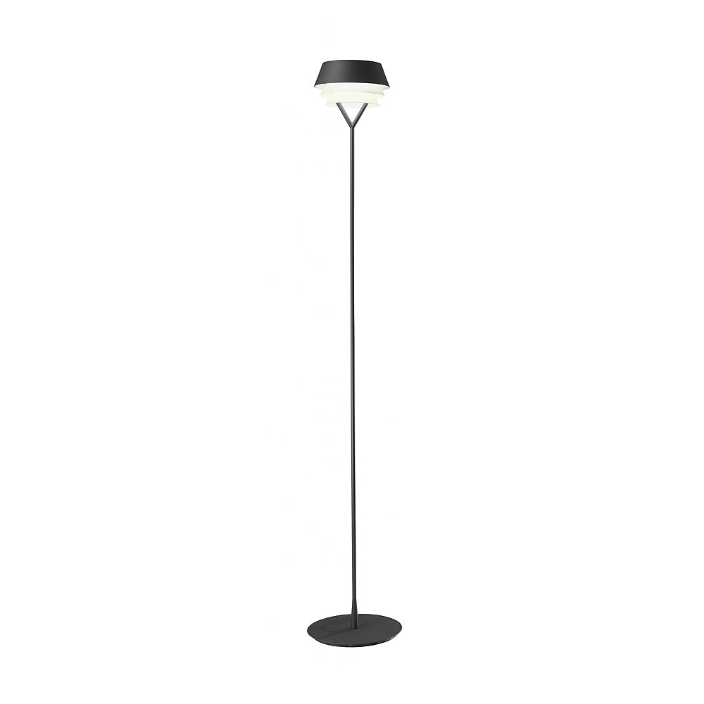The Gala Floor Lamp features a metallic body and triple shade in black or grey finish.