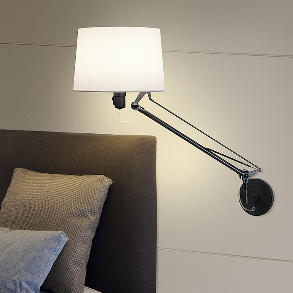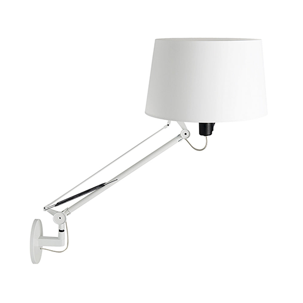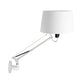 The Lektor Wall Light features a metallic adjustable and movable arm and a white polycarbonate shade.