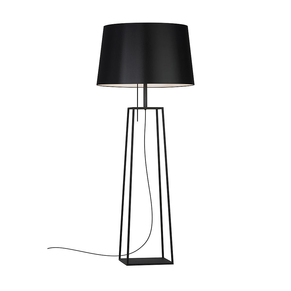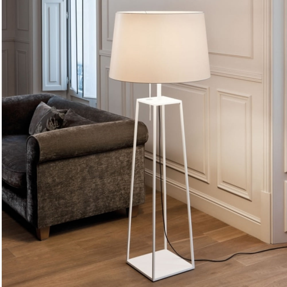 The Tiffany 1 Floor Lamp features a metal base and cotton drum shade. Available in black structure with black shade and white structure with white shade. The lamp structure is made of four columns attached to a square flat base. Switcher on the lampholder.