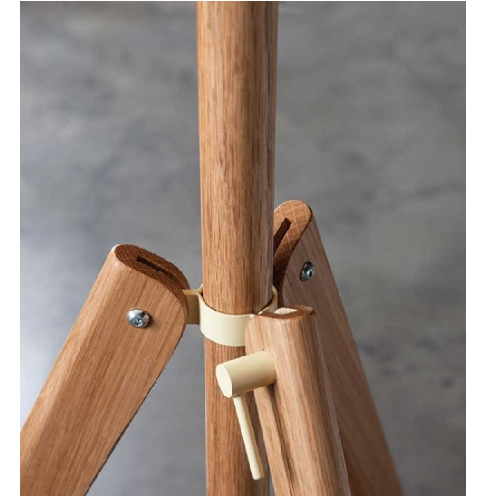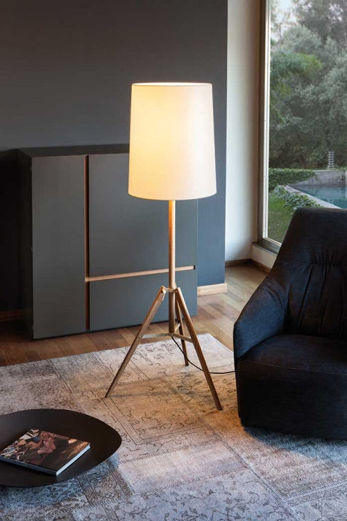 The Tripod Floor Lamp is made from oak with a satin varnish and support a beige fabric shade. The Tripod floor lamp creates beauty from simple geometry with its bold base and clean design. Available in two different sizes.