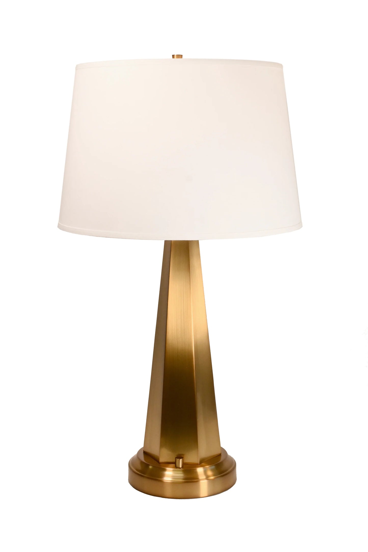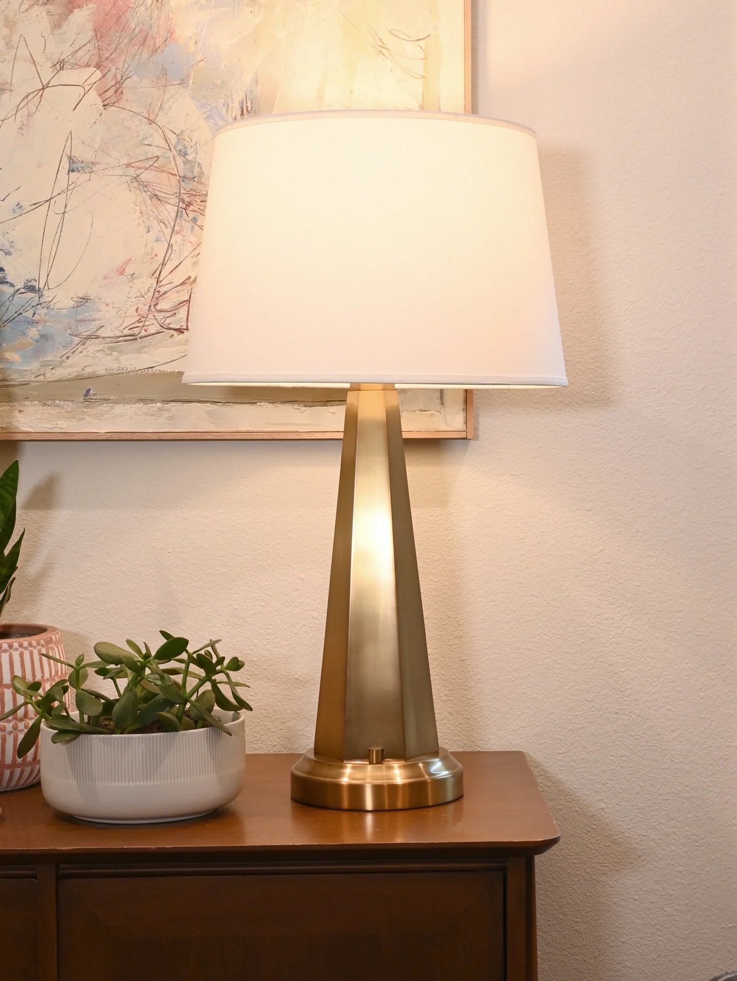 Simple design forms artistically put together to create a dramatic modern table lamp, that is done in a beautiful electroplated brass finish. This hexagonal lamp is topped off with an off white linen shade that makes for a truly unique lamp that looks great from any angle (and you'll never see an ugly cord!). This modern styled lamp is solely powered by our newest generation 3 rechargeable, high performance Li-Ion 12V battery. This eco-friendly includes the LED 12V bulb. Charge up the battery (hidden in our base), and light up your home anywhere you desire, regardless of outlets.