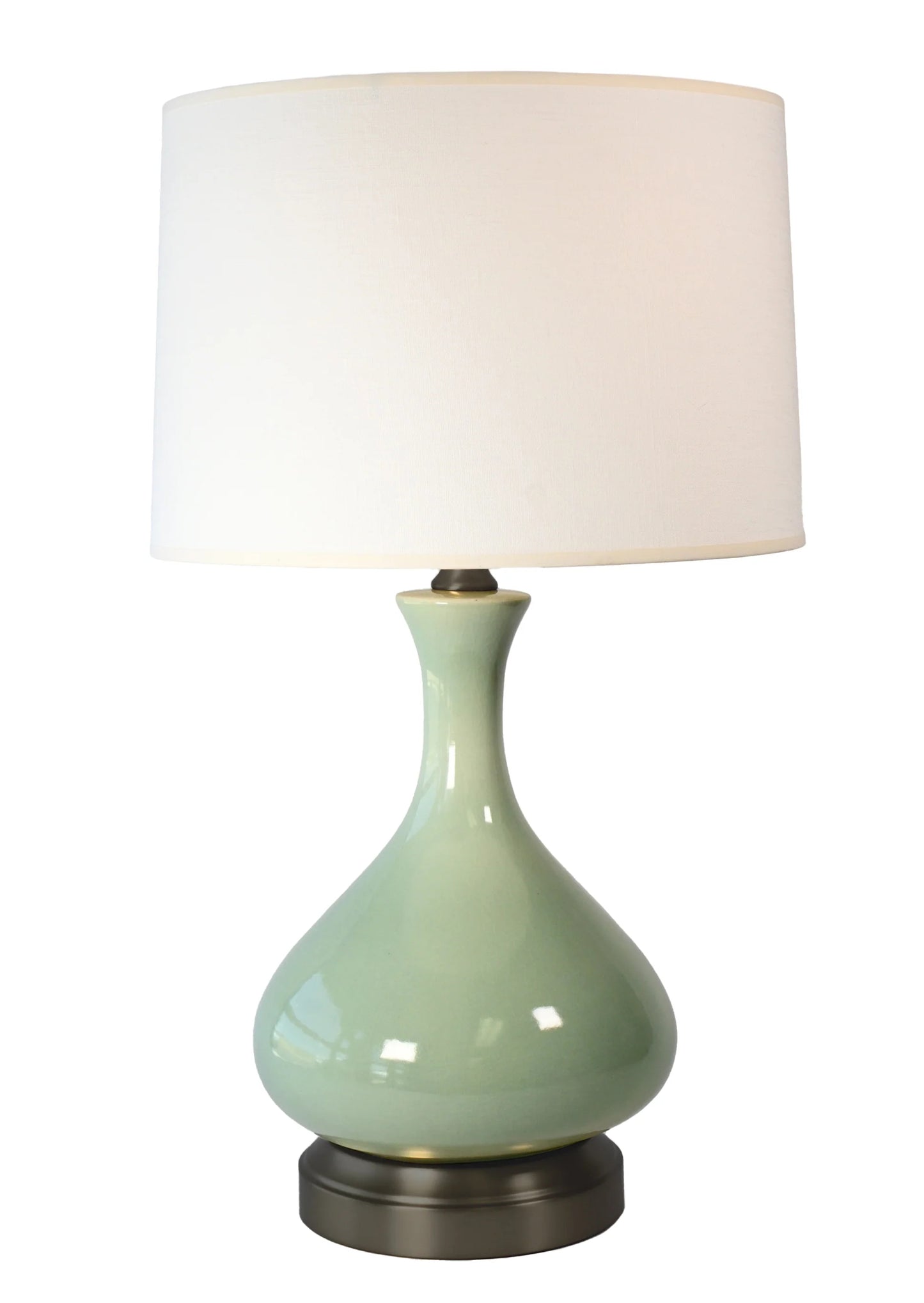 • Blue/Green or Celadon crackle ceramic body and black metal components with an off-white fabric drum shade