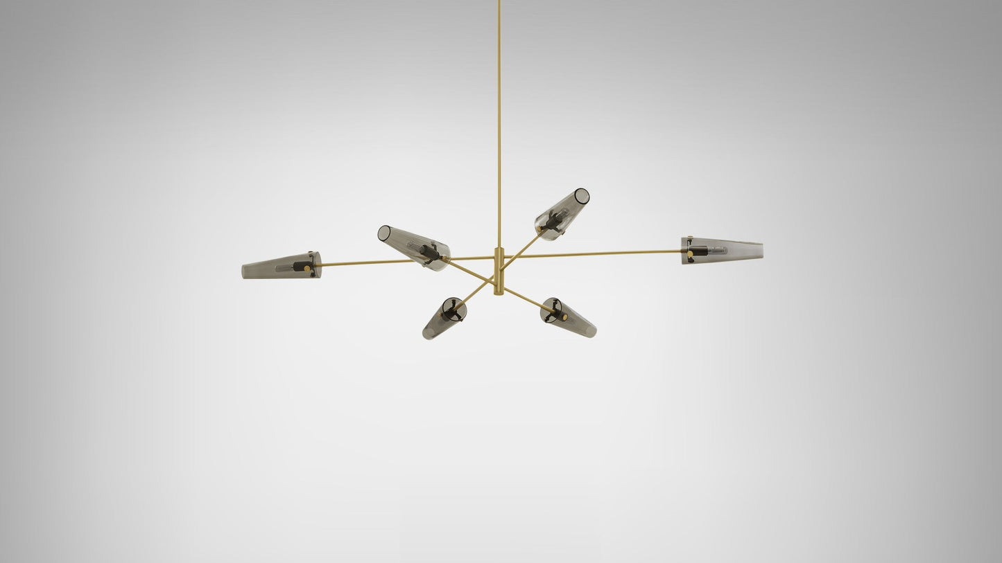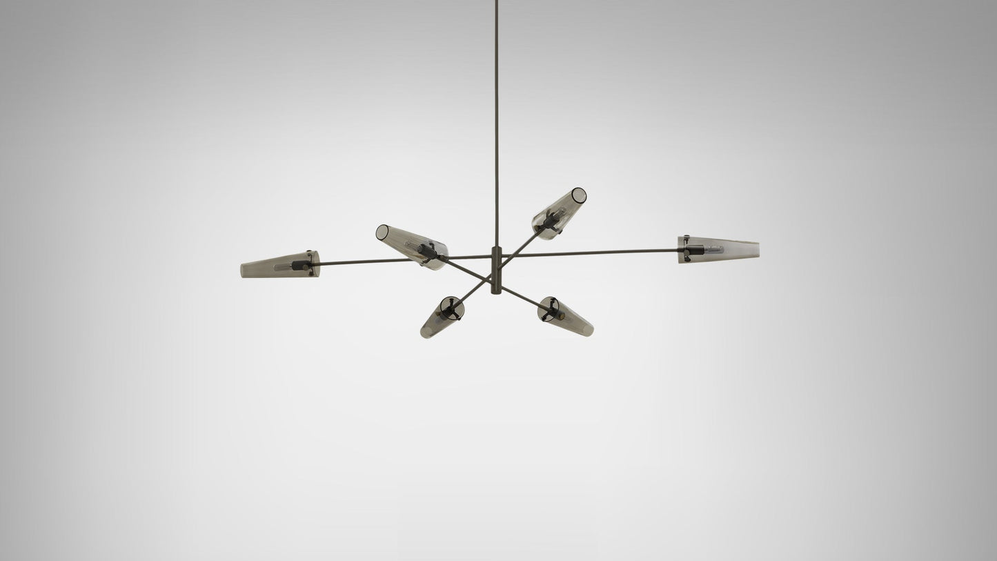 A modern decorative pendant, inspired by antique street lamps that blends linear form with decorative details to deliver a unique combination that is a great centrepiece to an interior. Finished in satin brass or bronze with conical smoked glass shades.