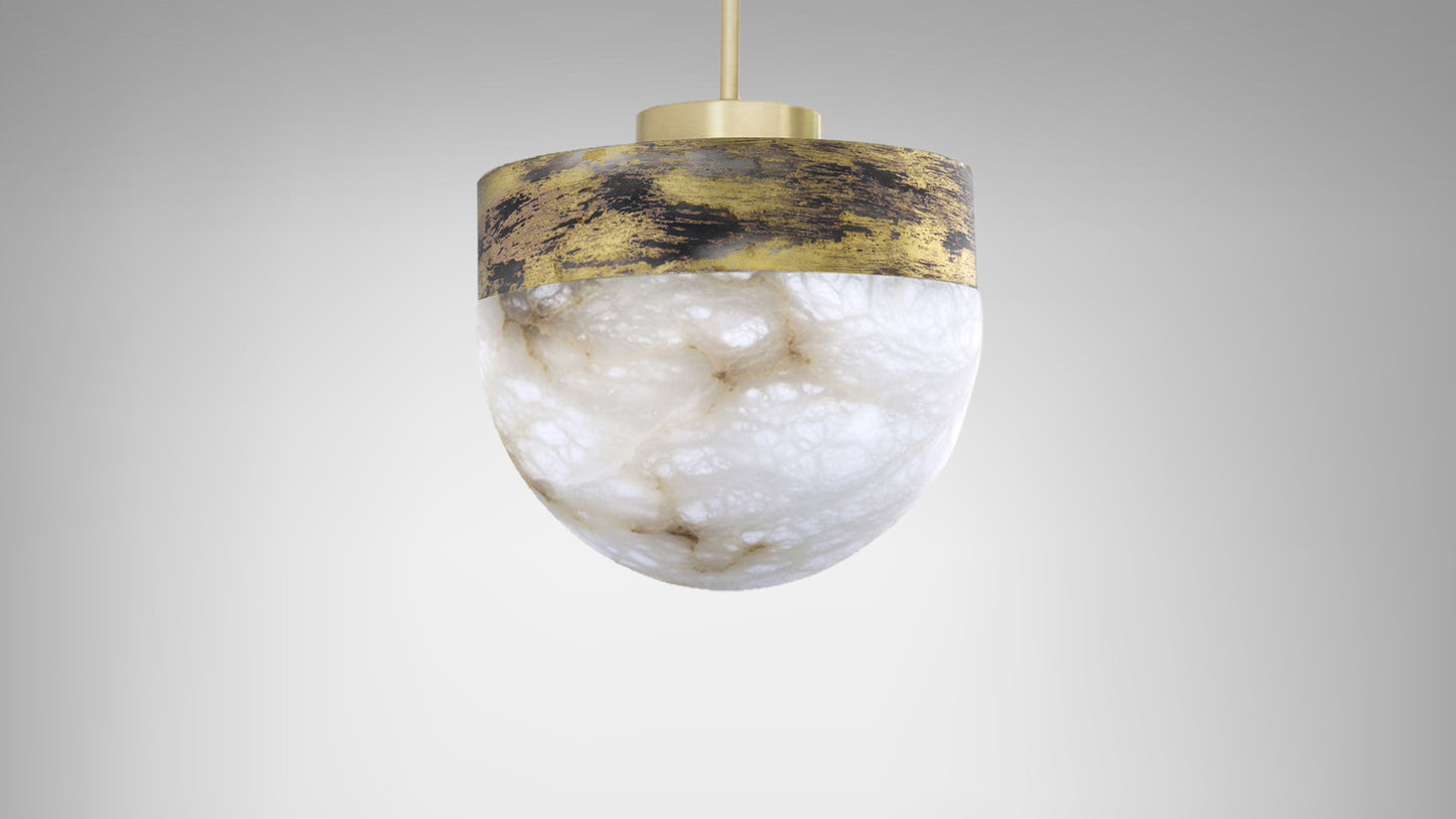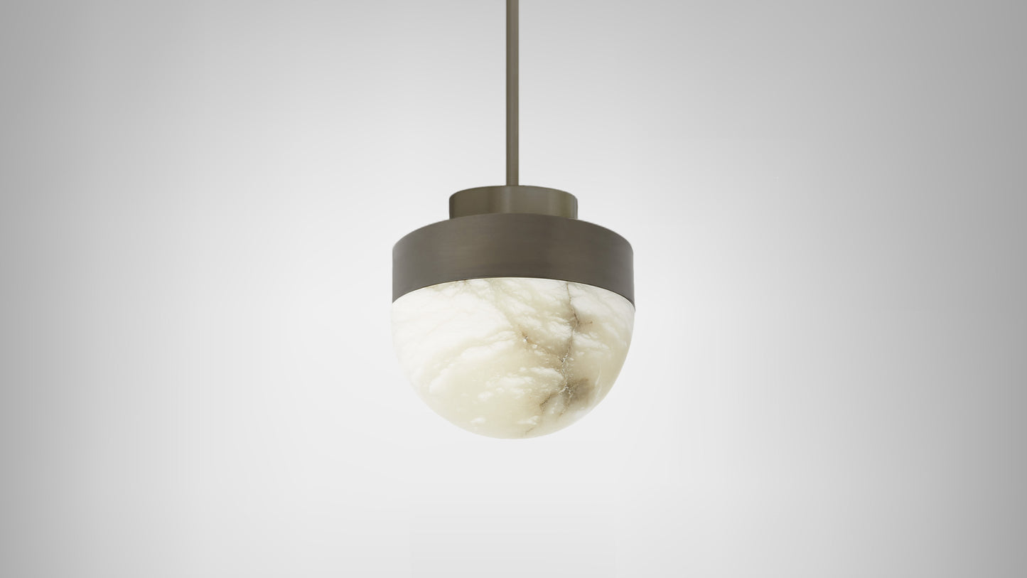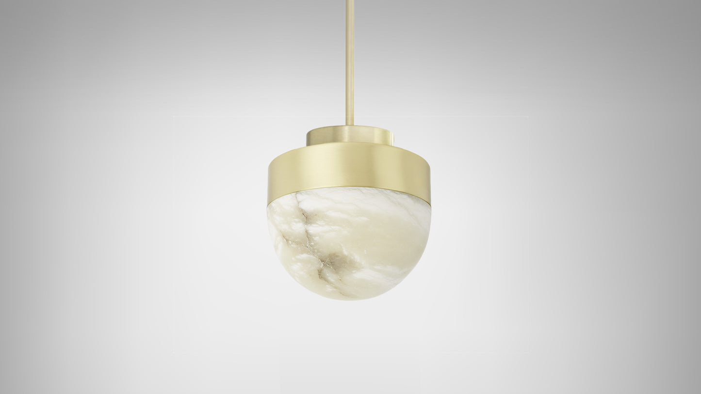 LUCID is a refined yet striking pendant light that features a dome of honed alabaster, suspended from the ceiling by minimal, engineered metalwork. The LED emanates light from beneath the surface of the natural stone, highlighting the unique veining. Casting a warm, ethereal glow, the light source can be dimmed to alter the illumination effect to suit your specific need. The simplicity of this contemporary pendant lends itself to a composition of multiples, especially in groups of three over a kitchen island, dining table or bar. For a modern statement, LUCID can also be installed in clusters of different sizes and finishes.