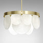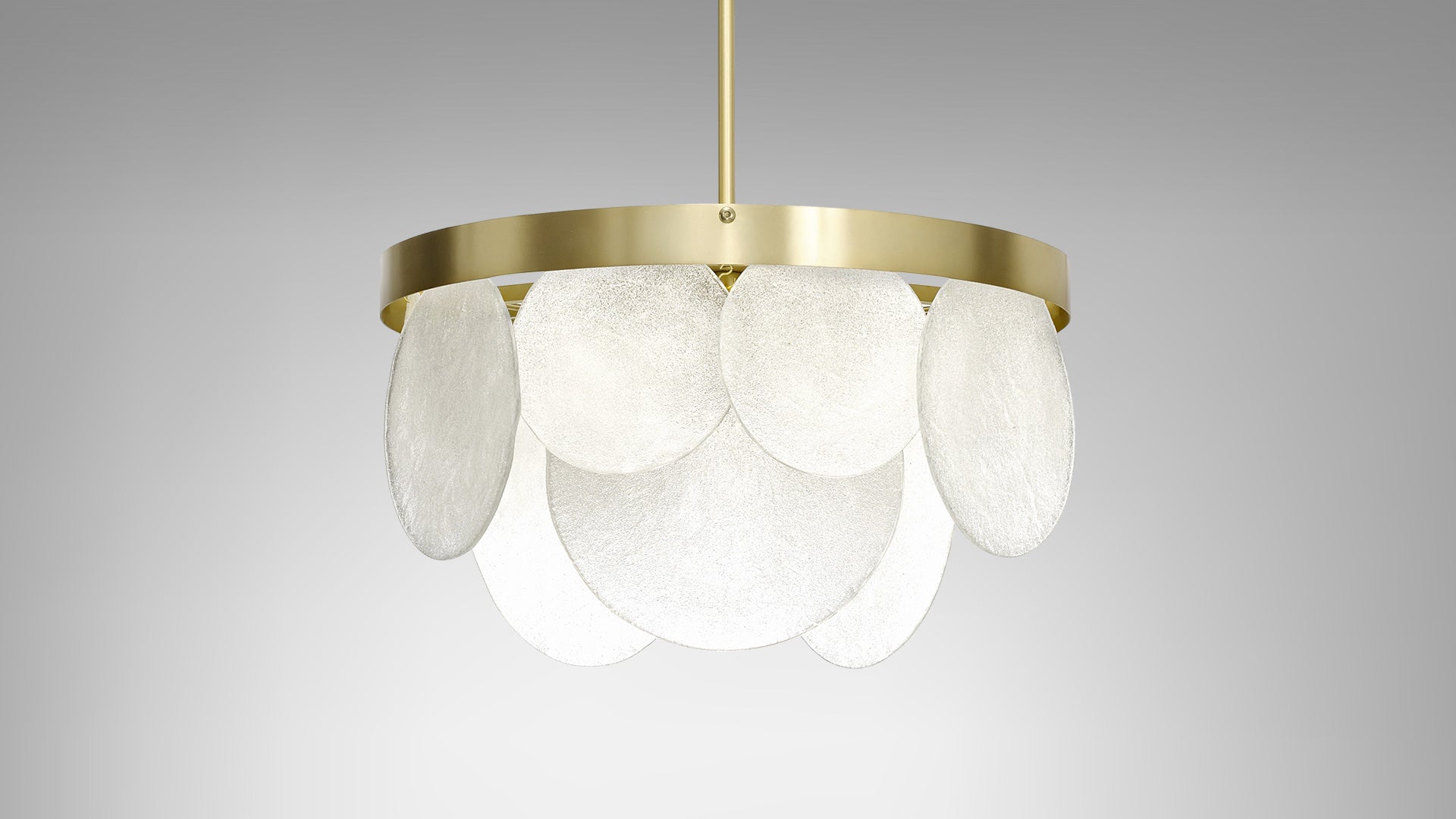 Each piece of glass is unique. The droplets are hand-formed by our artisans using a process where undulations and crystal-like textures form, contrasting with a luxurious satin brass collar.