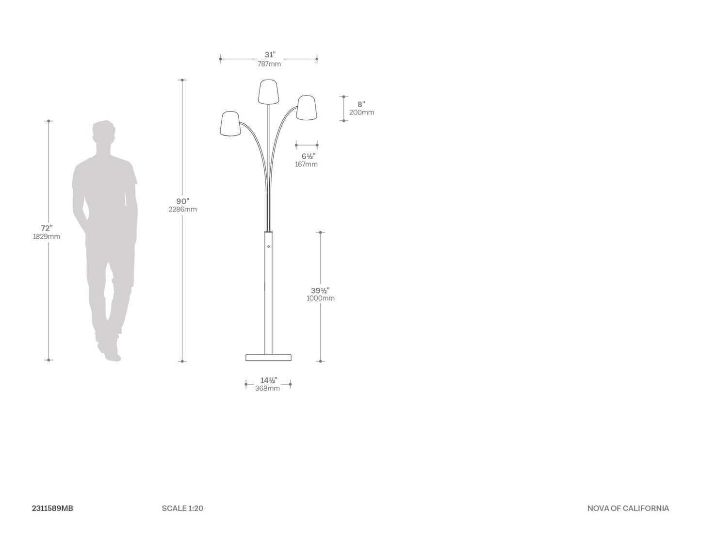 Culver 3-Light Arc Floor Lamp 86" Matte Black Weathered Brass Dimmer Switch sku: 2311589MB | Nova California
