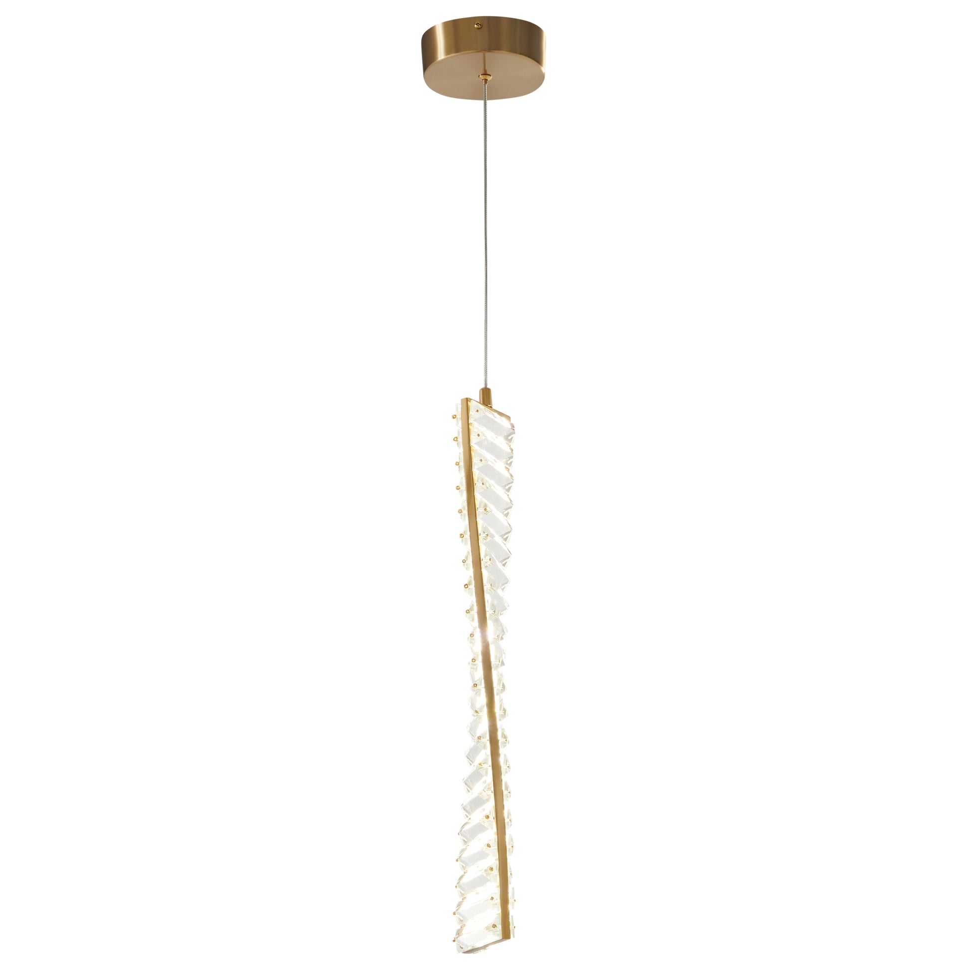 The Efell Brushed Gold pendant, is a stunning LED crystal masterpiece that combines elegance, functionality, and modern design. Features a brushed gold finish in a twisted vertical line that exudes opulence and refinement, high-quality crystals that refract light beautifully, creating a dazzling display of brilliance that will enchants any space, guaranteed to be the centerpiece of any room, radiating an aura of luxury and sophistication.