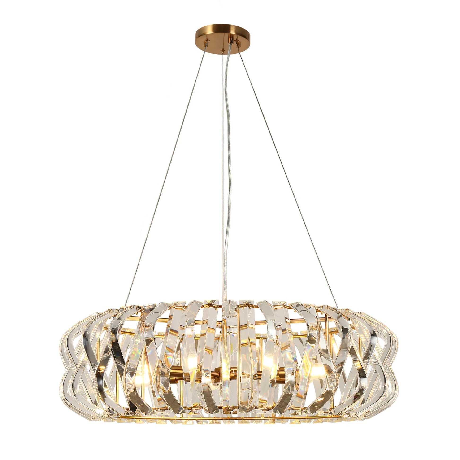 This stunning chandelier is the perfect way to add a touch of glamour to any space. With its sleek brass finish, sparkling crystals, and modern drum shape, the Eurydamas 28" chandelier is sure to turn heads.