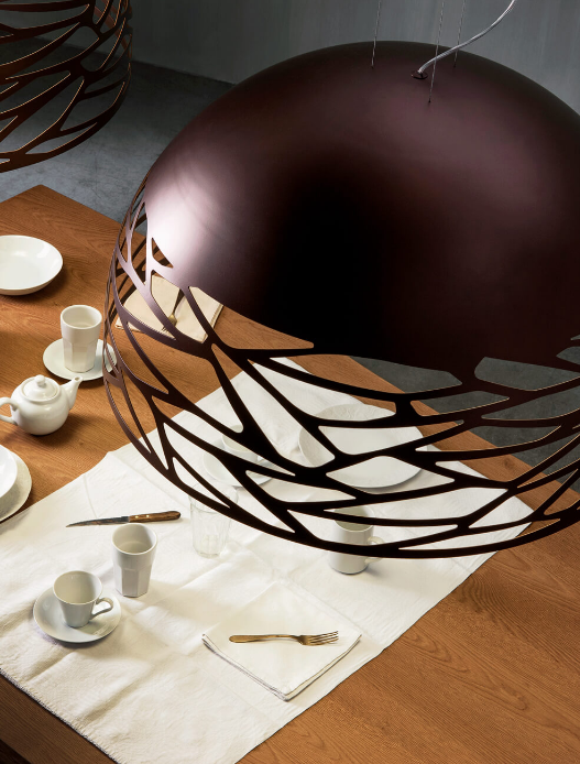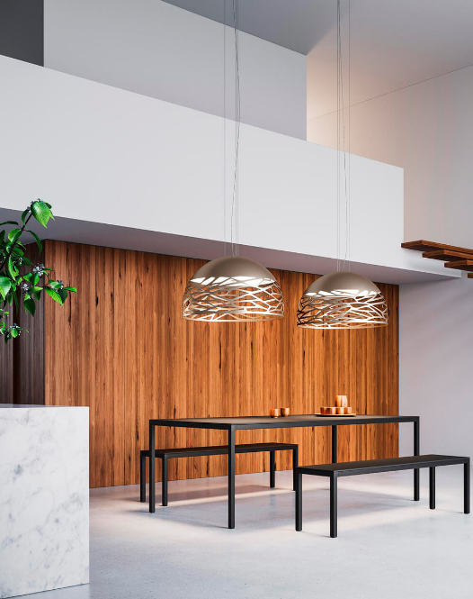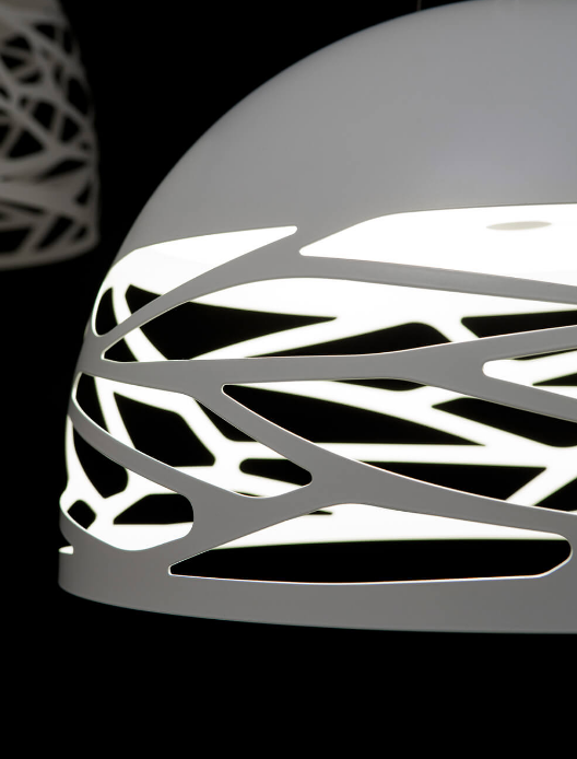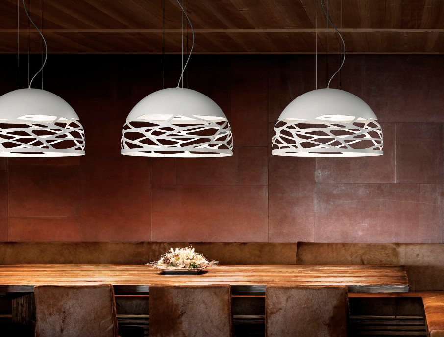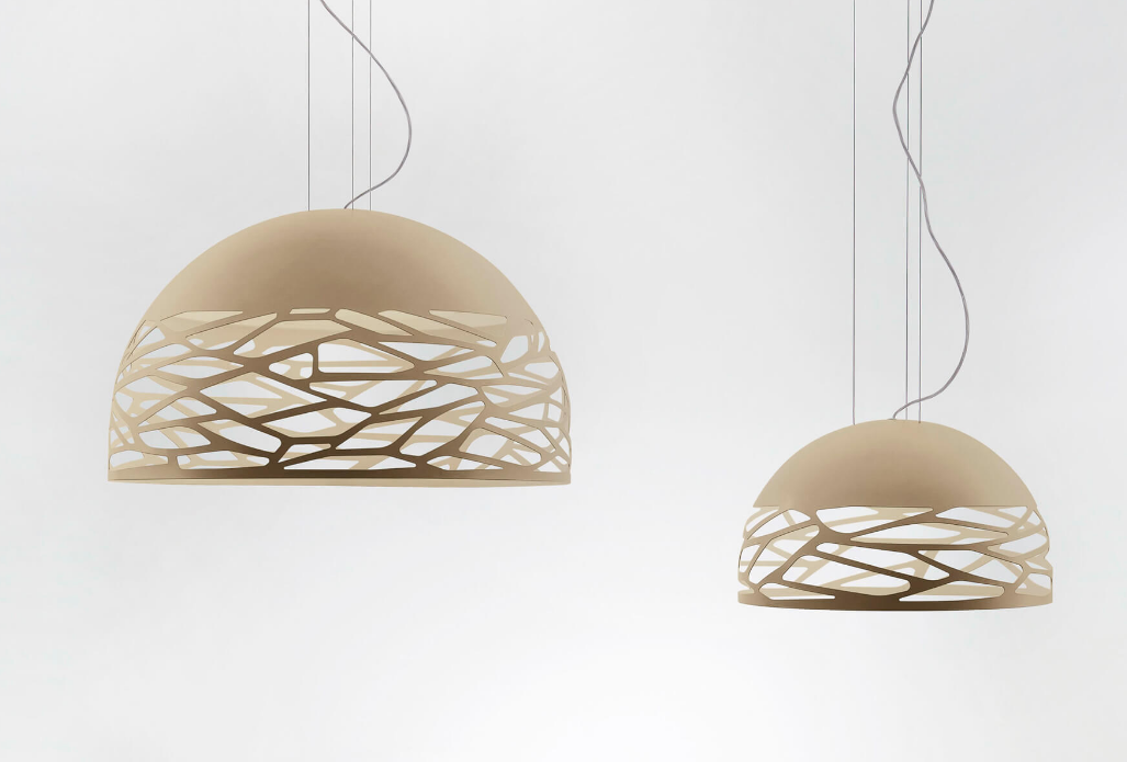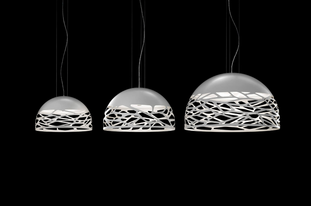 THe Kelly Dome Pendant, designed by Andrea Tosetto, features a simple and timeless design, combining light and shadows with a unique laser cut pattern. Features a Milk White inner diffuser with Matte White, Coppery Bronze, or Matte Black finish. Includes Matte White canopy and clear cord. Top glass diffuser covers light bulbs and provides uniform light output. Available in three sizes.