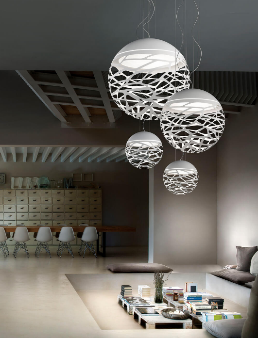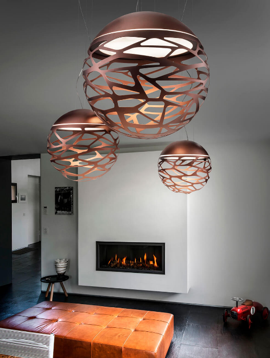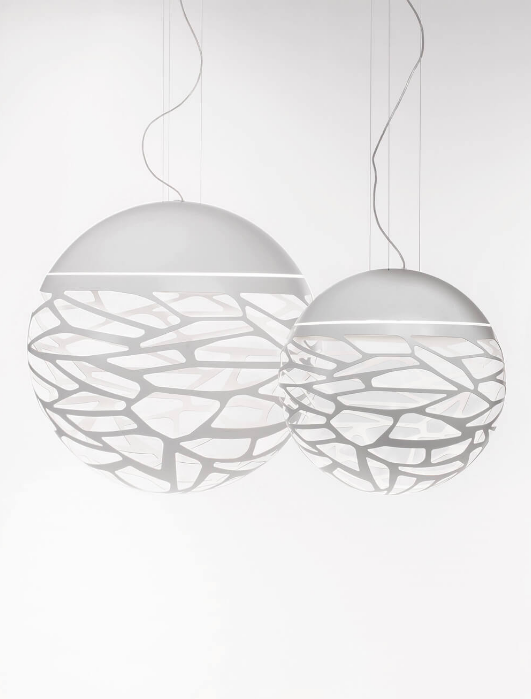 Kelly Sphere Pendant has a simple and timeless design with light shadows from the unique laser cut pattern. Kelly is the ultimate in decorative design for traditional and avant-garde spaces. Available with a durable metal frame in Milk White color and Matt White or Coppery Bronze finish. Includes white canopy and clear electrical cord. Top glass diffuser covers light bulbs and provides uniform light output. UL listed.