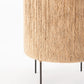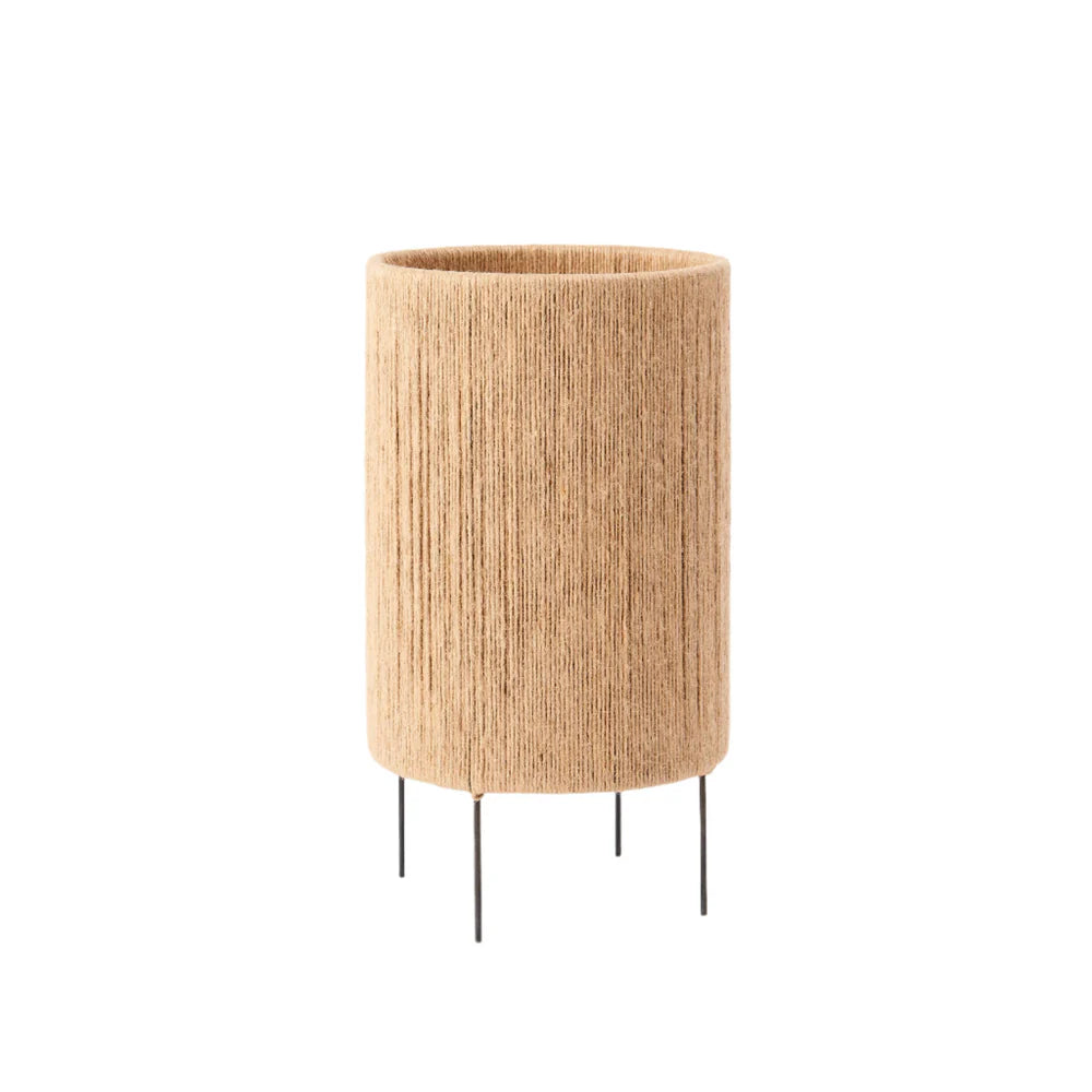 Table lamp with switch on braided fabric cord, providing diffused ambient light. Production Process: Jute yarn is strung across two iron rings crating the cylindrical shade.