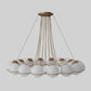 Each sphere is held in place by a large Black or Champagne painted steel radial ring structure. The spheres can be oriented downward or upward to provide direct or indirect illumination.