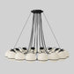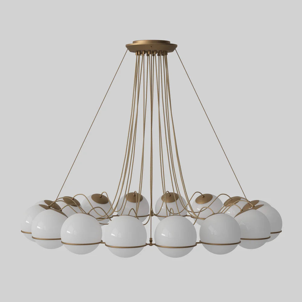 Each sphere is held in place by a large Black or Champagne painted steel radial ring structure. The spheres can be oriented downward or upward to provide direct or indirect illumination.