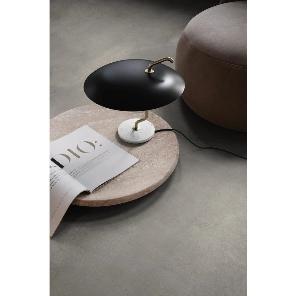 Model 537 is a simple yet stunning lamp that combines high-quality materials and clever design. The big reflector, in either black or white, is attached off-center to a shiny or matte brass stem that curves gracefully and balances on a sleek marble base. The stem also extends through and past the reflector in a whimsical gesture, creating both a visual appeal and a handy grip.