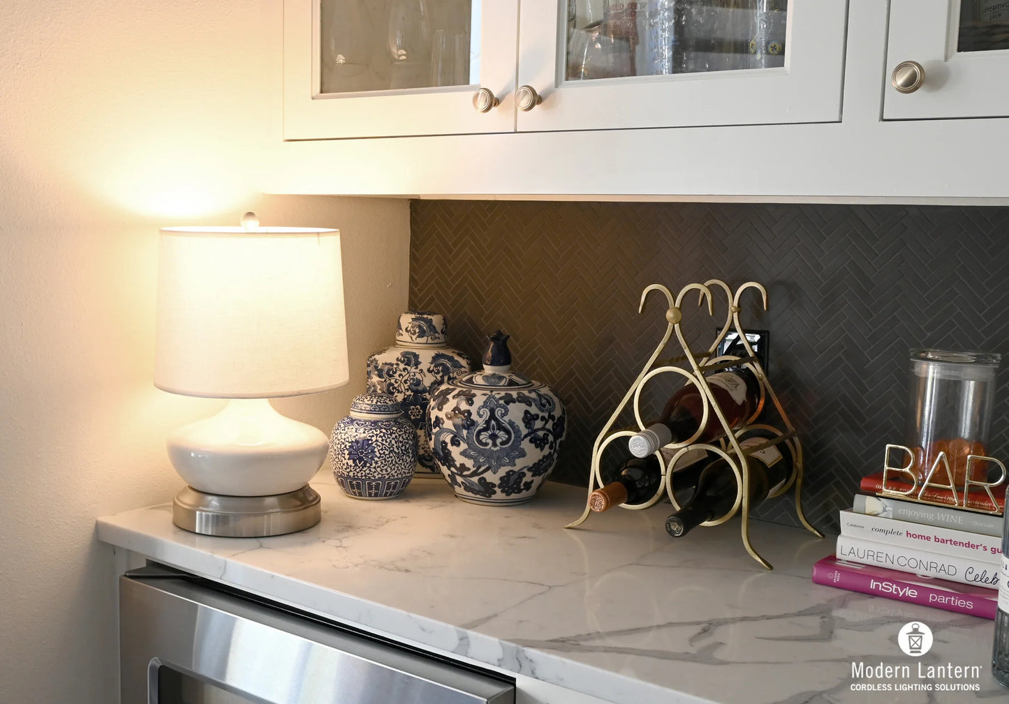 Short Ivory Ceramic on Nickel Rechargeable Battery Operated Lamp by Modern Lantern