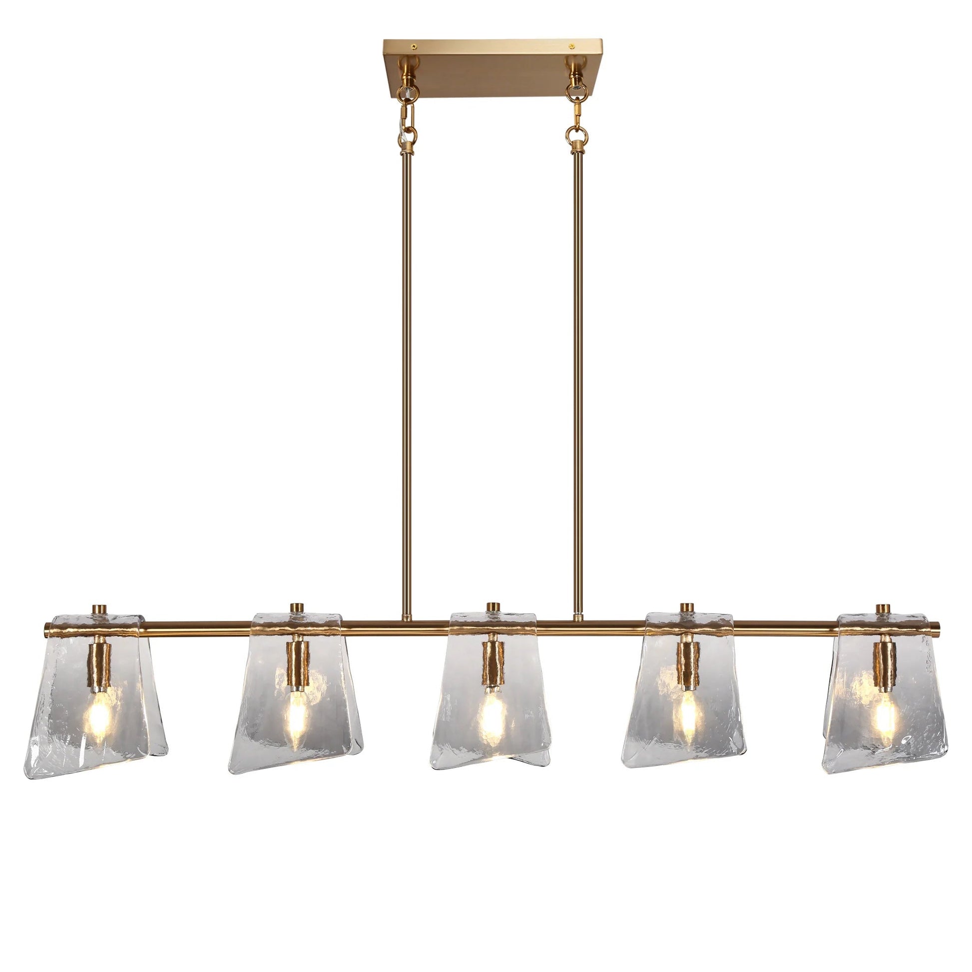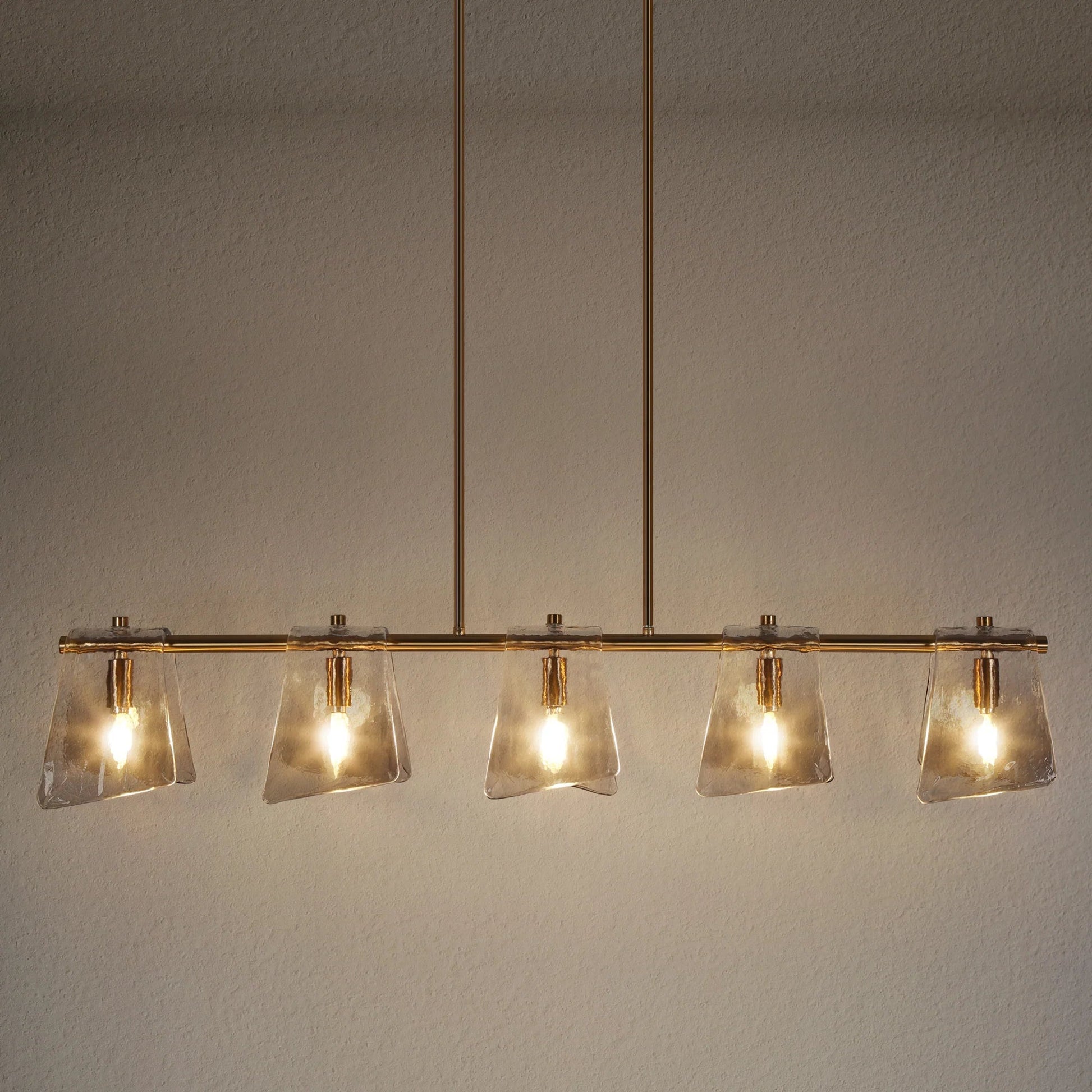 Introducing the Afmean 5-Light Linear Pendant Light, a stunning blend of modern design and captivating illumination. This island chandelier boasts a sleek brass finish and unique smoky irregular glass shades, creating an ambiance of sophisticated luxury in any space.