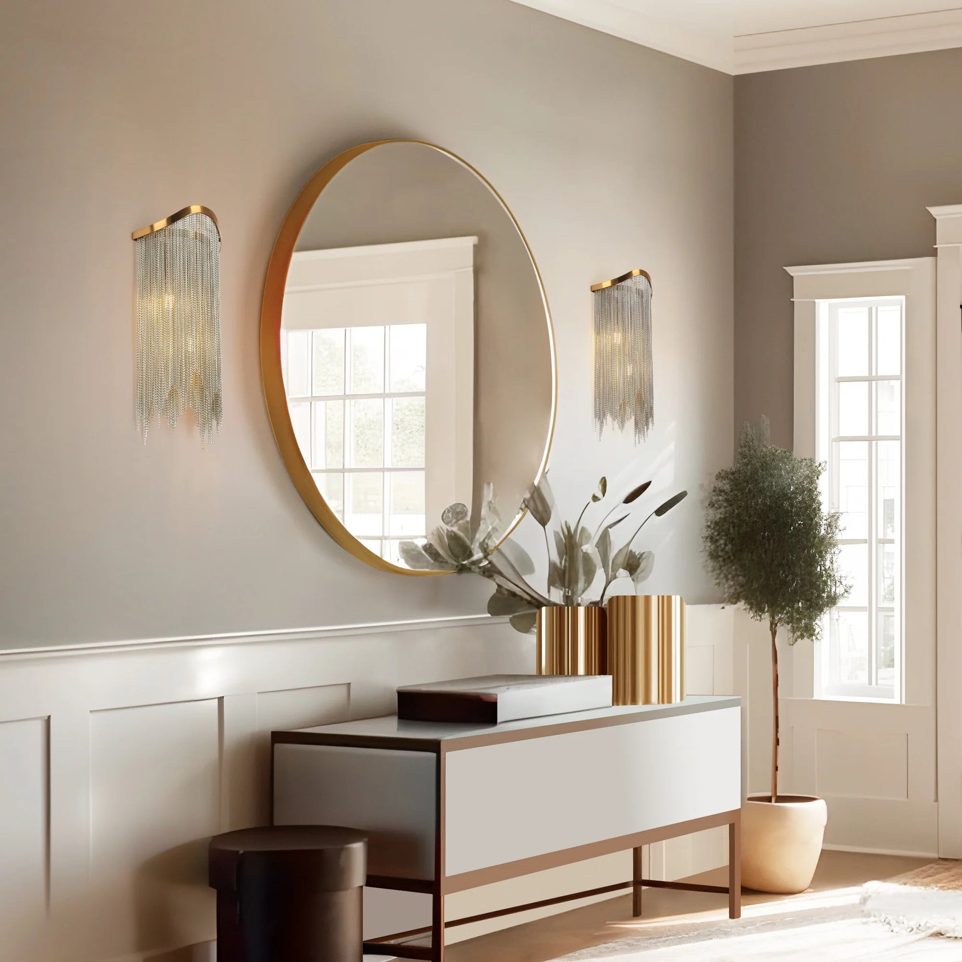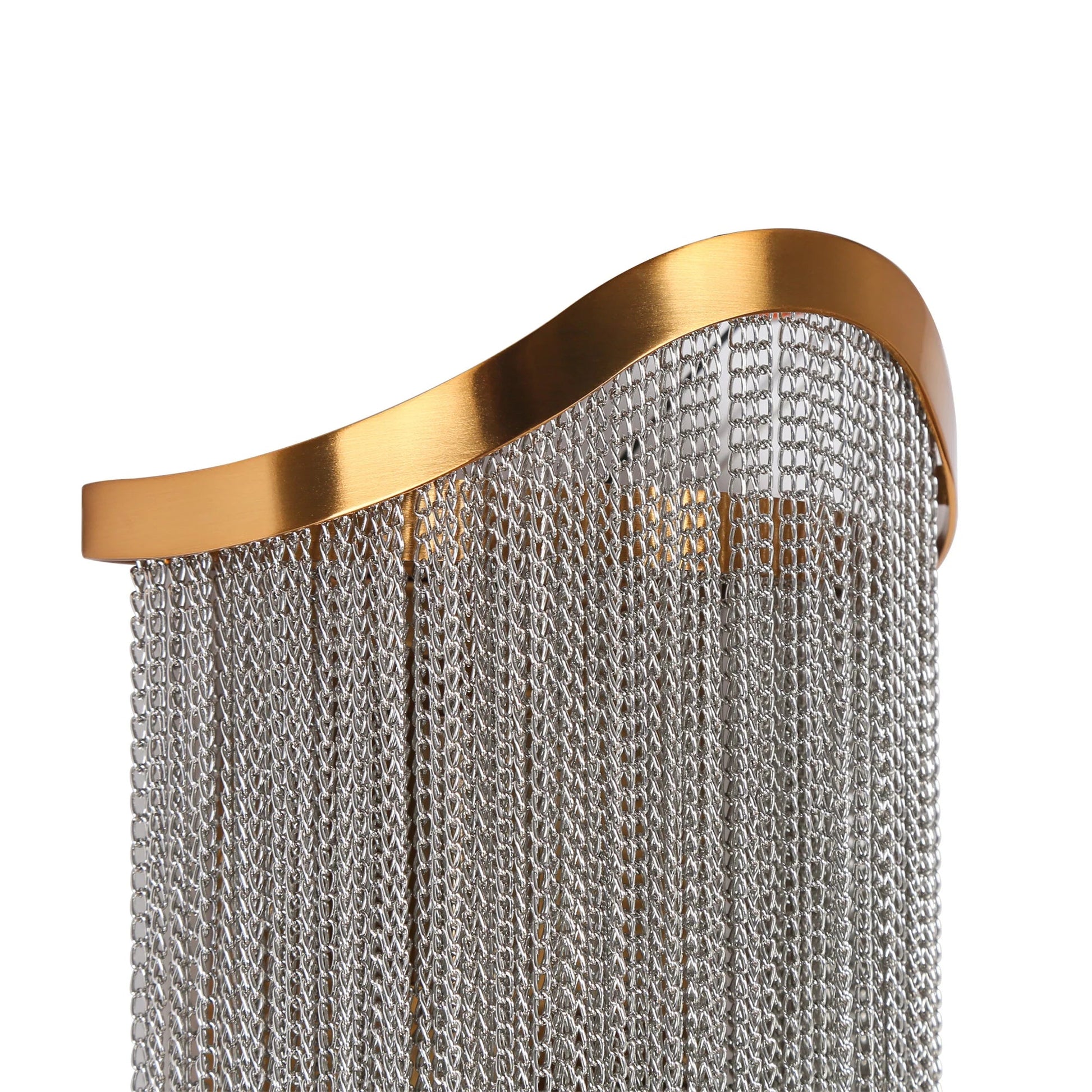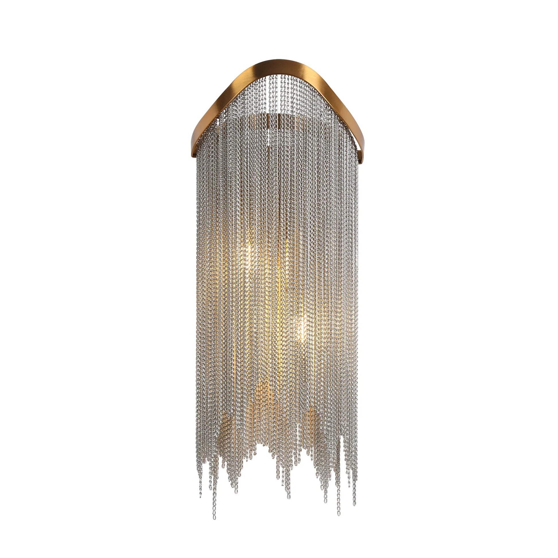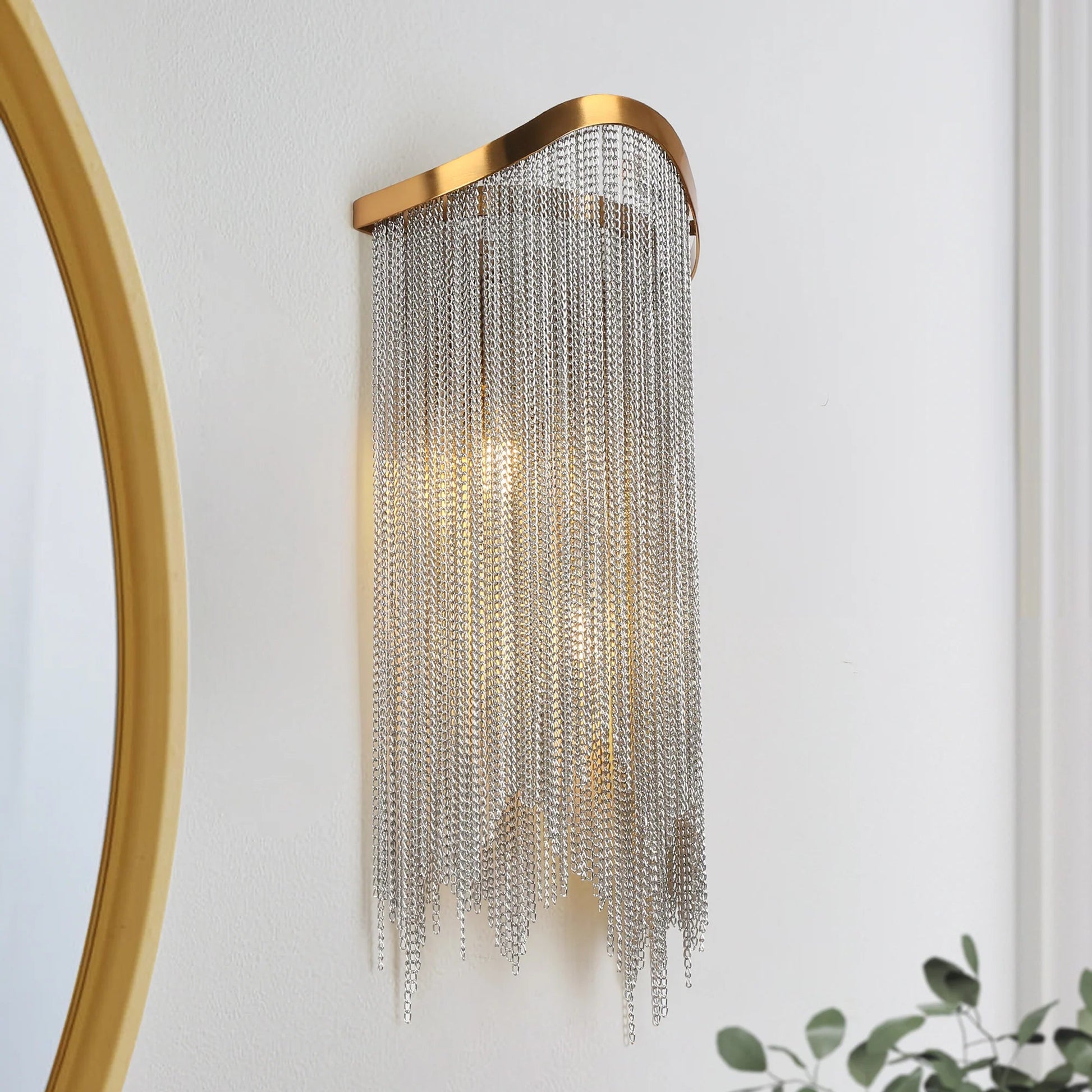 Transform your space with the Shoebill 2-Light Modern Brass Wall Sconce. This stunning fixture features a unique design of cascading metal rods and iron, creating a mesmerizing light display that mimics the beauty of falling rain. The slender rods, suspended from a sleek canopy, produce a captivating refractive effect, adding a touch of elegance and drama to any room.