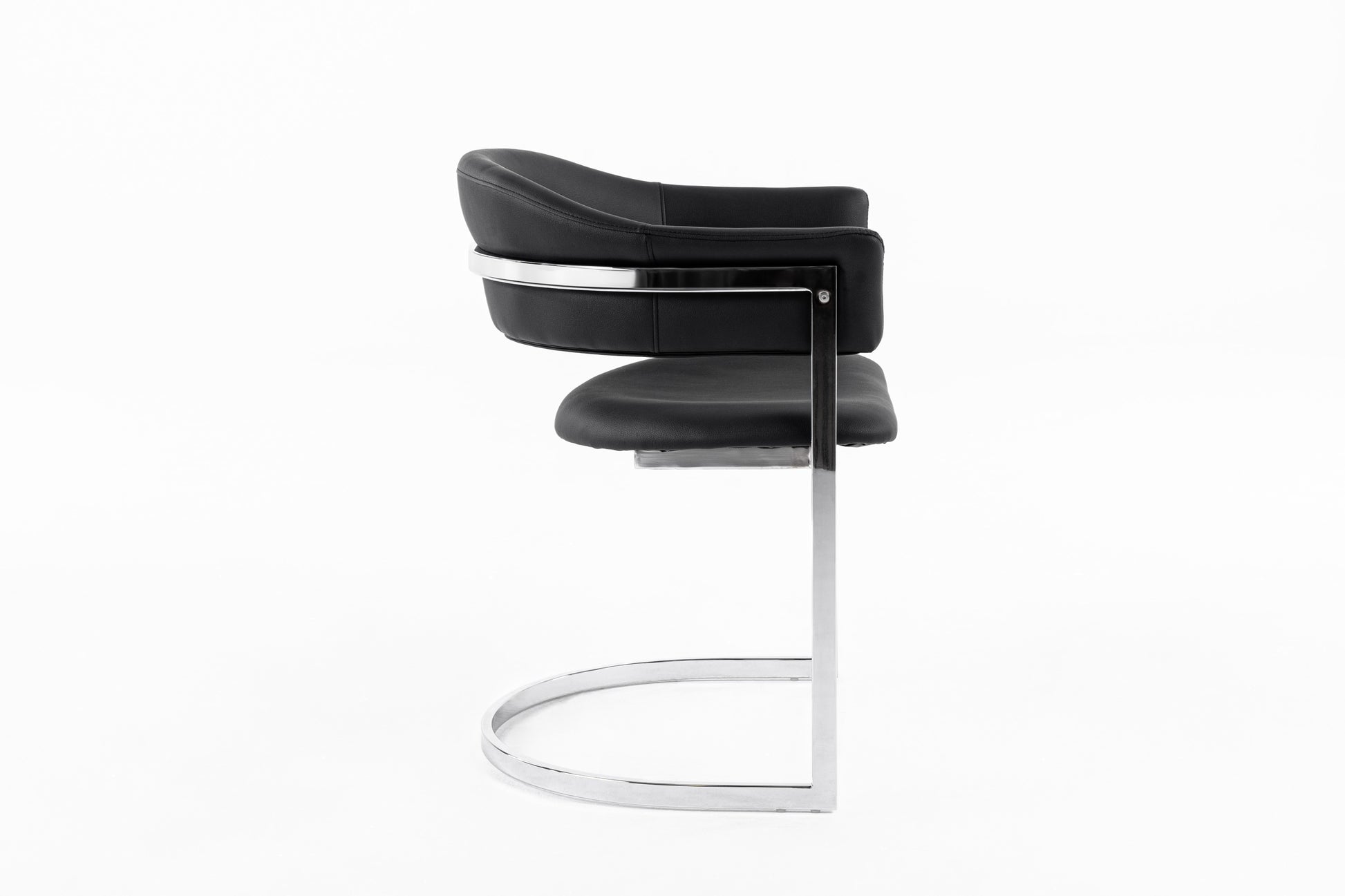 The Modrest Allie Contemporary Black Leatherette Dining Chair features luxury black leatherette upholstery in a sturdy stainless steel frame with a semi-circle base. This black leatherette dining chair is also available in white.