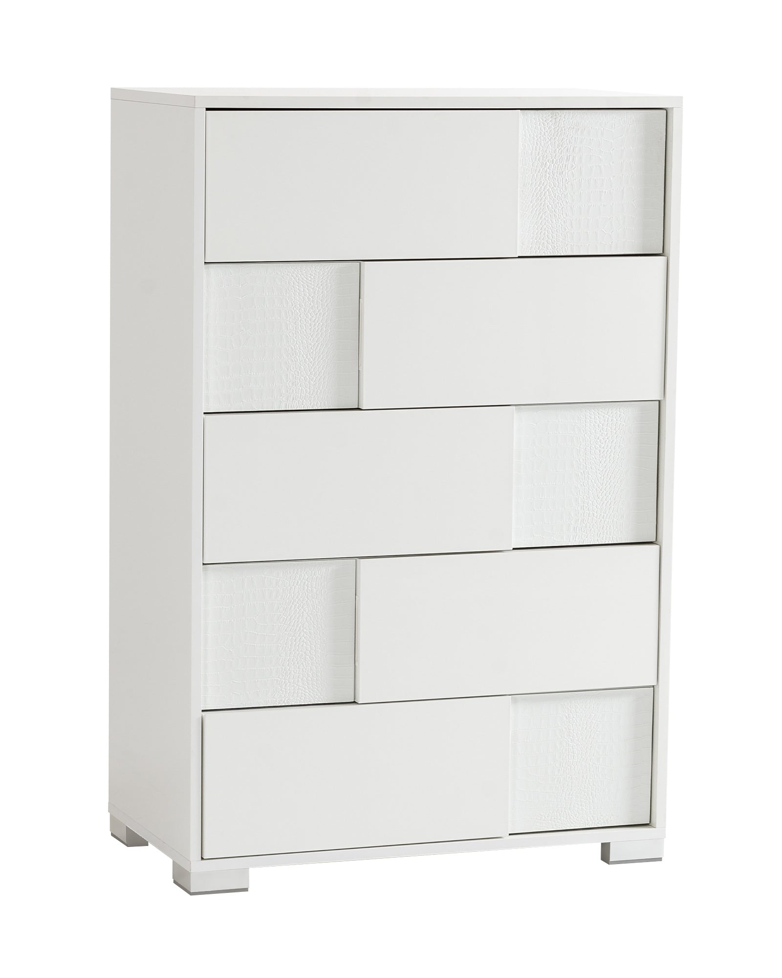The Modrest Ancona Italian modern white chest offers elegance and functionality at its best featuring a dainty white gloss and crocodile textured finish and 5 spacious drawers. Made in Italy, it stands on sturdy square metal legs and is also available in black and beige colors. This modern white chest measures W33" x D19" x H50".