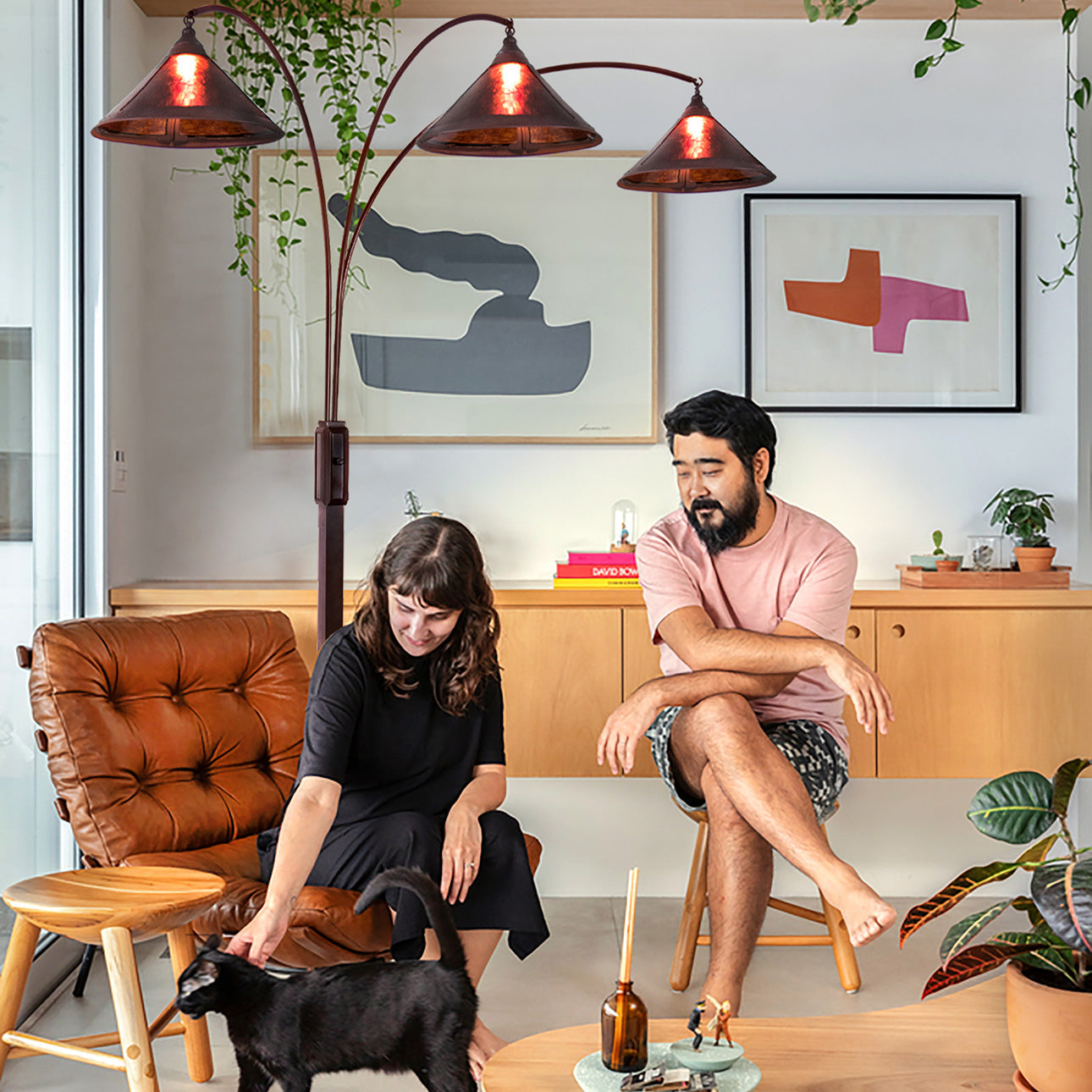 Originally designed in 1999 by Mervin Weitz, the Mica 3 Light Arc Floor Lamp has long been one of our most popular designs. Drawing inspiration from the early 1900s Arts & Crafts style lamps, the designer then paired the functional craftsmanship with classic mid-20th century modern elements. The result? An heirloom-quality floor lamp that produces a warm, fiery glow only achieved through its natural mineral Mica shades.