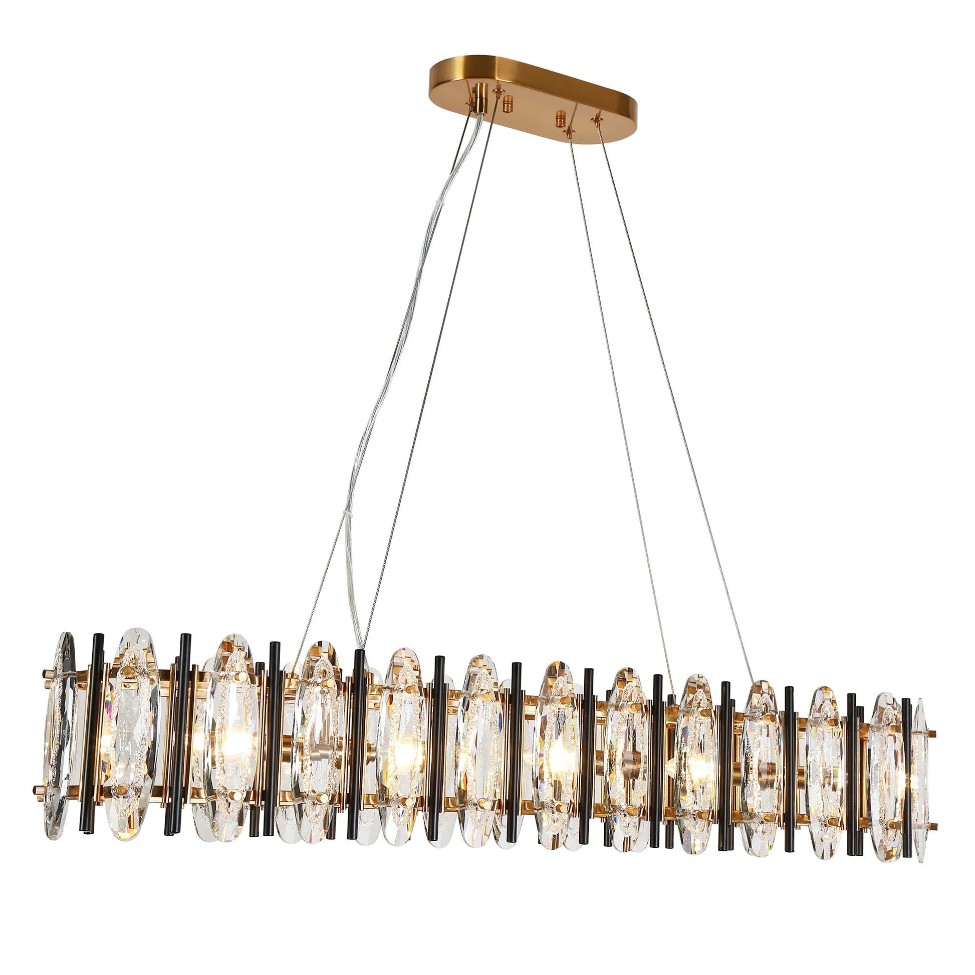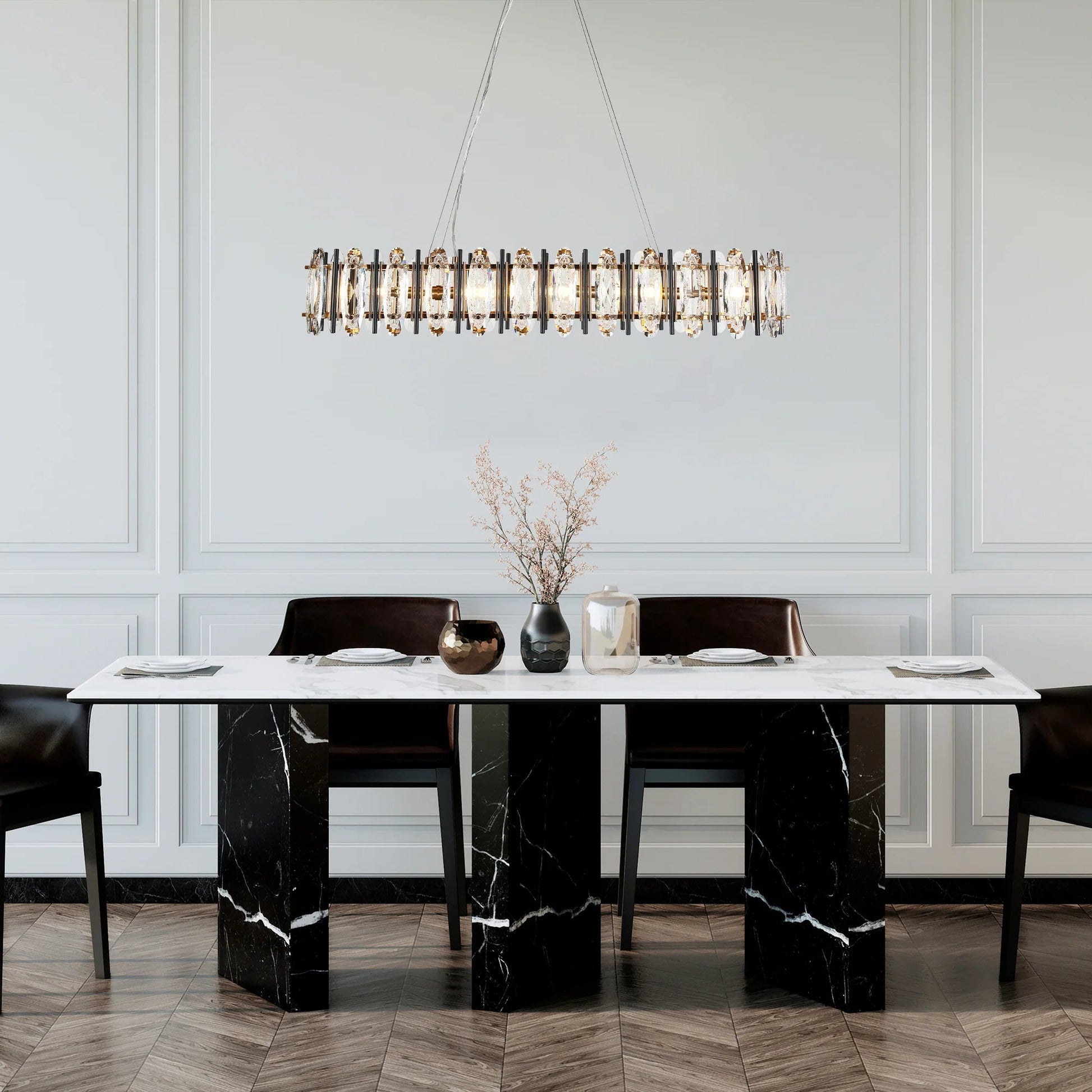 Transform your dining room, kitchen island, or entryway with the Noctiflorous Modern Linear 5-Light Chandelier. This stunning fixture seamlessly blends contemporary design with classic elegance, featuring sleek lines, a striking matte black and plating brass finish, and sparkling crystal accents. With its adjustable height and dimmable capabilities, this chandelier offers both exceptional illumination and customizable ambiance to perfectly suit your space.