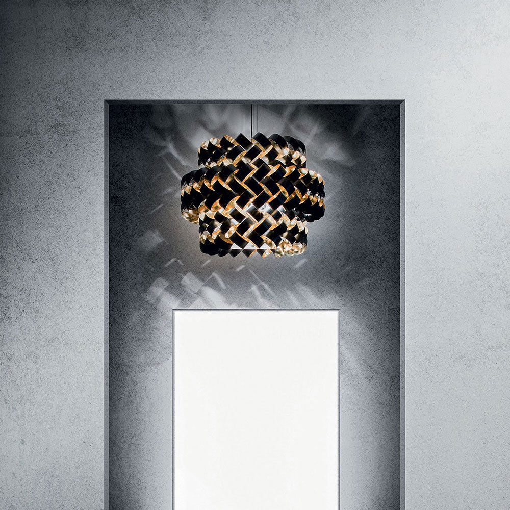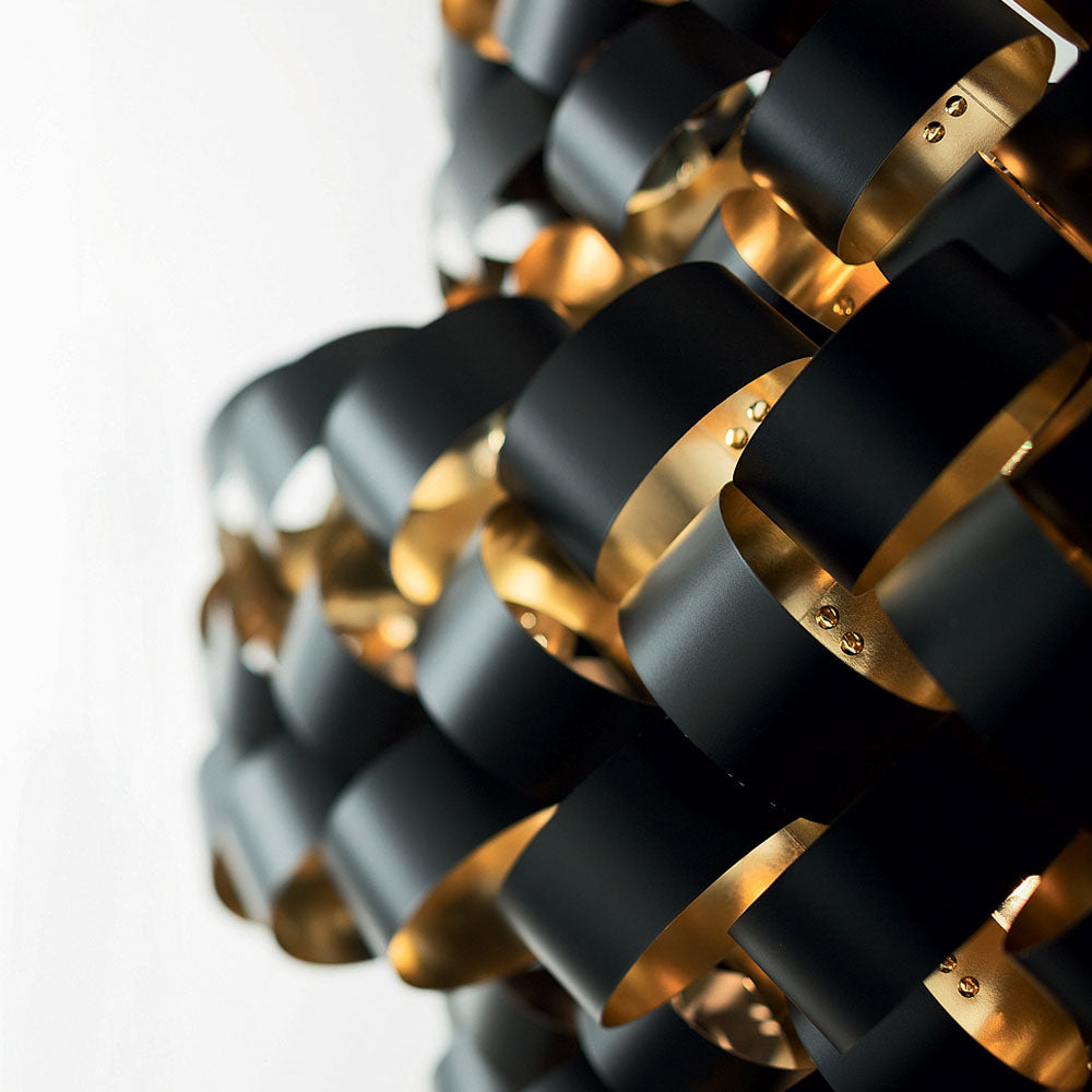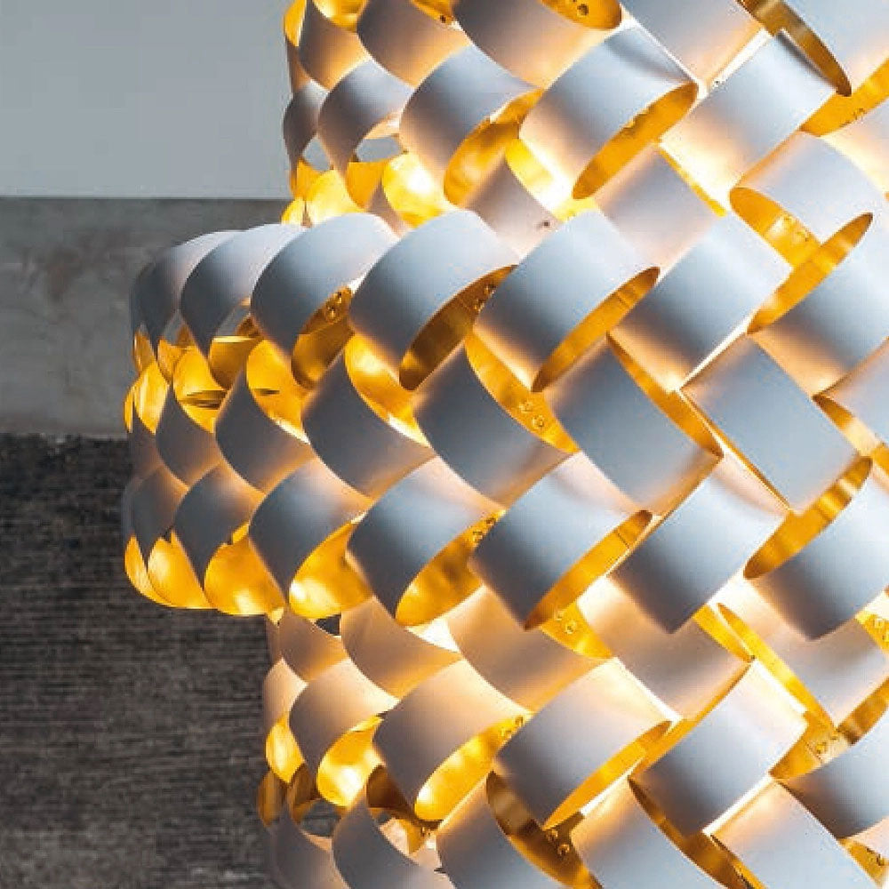 The Ring lamp, designed by Brian Rasmussen takes its name from the sequence of woven rings which define its original and unusual shape. A sort of bright crown which gives a touch of elegance to the space in which it is installed. Rings follow a geometric logic which seems to optimize the space. Ring Sphere is available as pendant. The rings of the diffuser ara made of PVC available in 3 finishes: gold, nickel and copper.