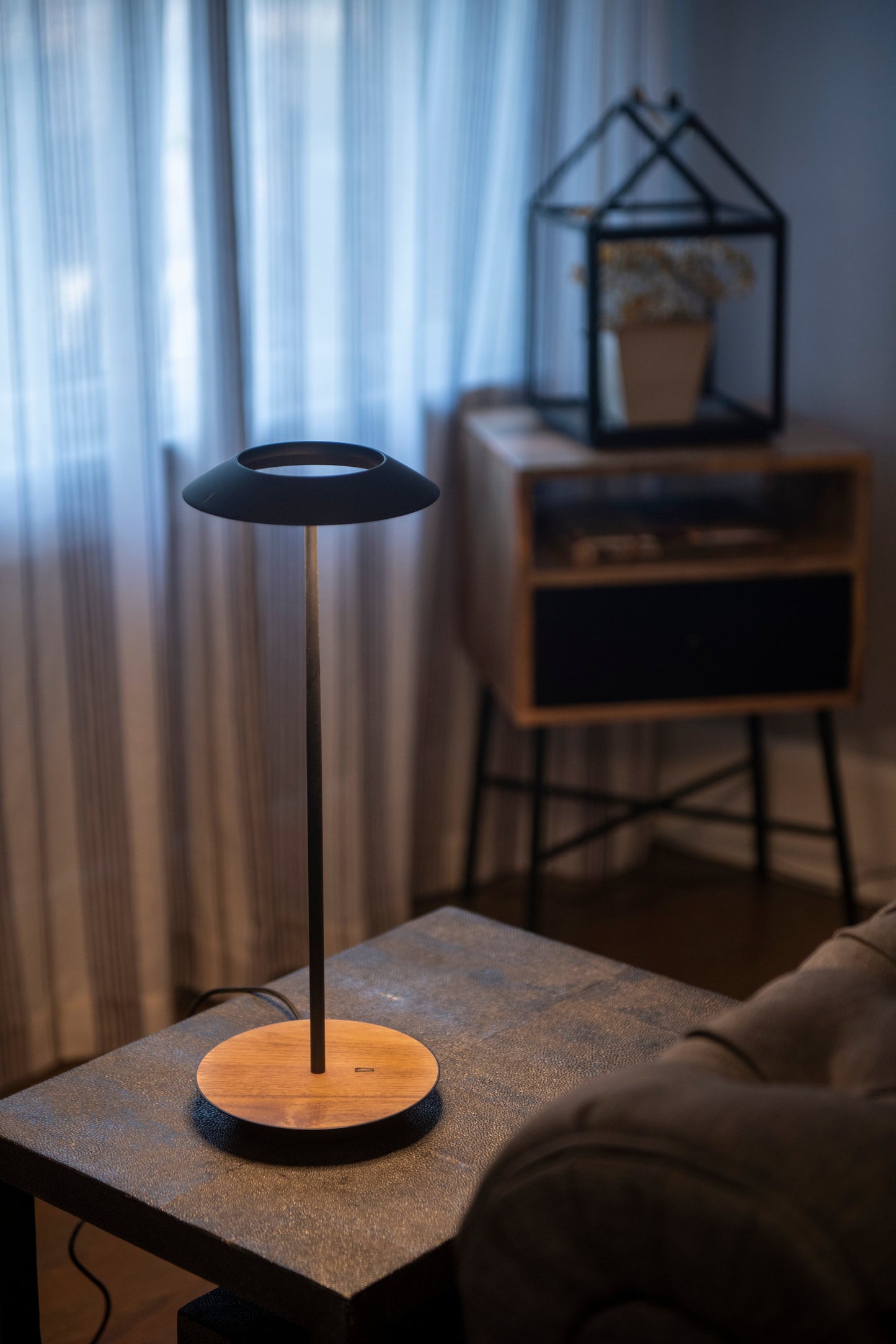 The Royyo Desk lamp adds an elegant flair to any space with its minimal wiring and pleasing circular design. Its minimal silhouette houses complex inner technology for a marriage of form and functionality. Royyo's embedded USB port allows users to charge any USB- compatible device. Interchangeable base plate options allow users to customize at ease. Achieve unity in design by inviting the Royyo Floor Lamp, Royyo Pendant and Royyo Desk Lamp into your home.