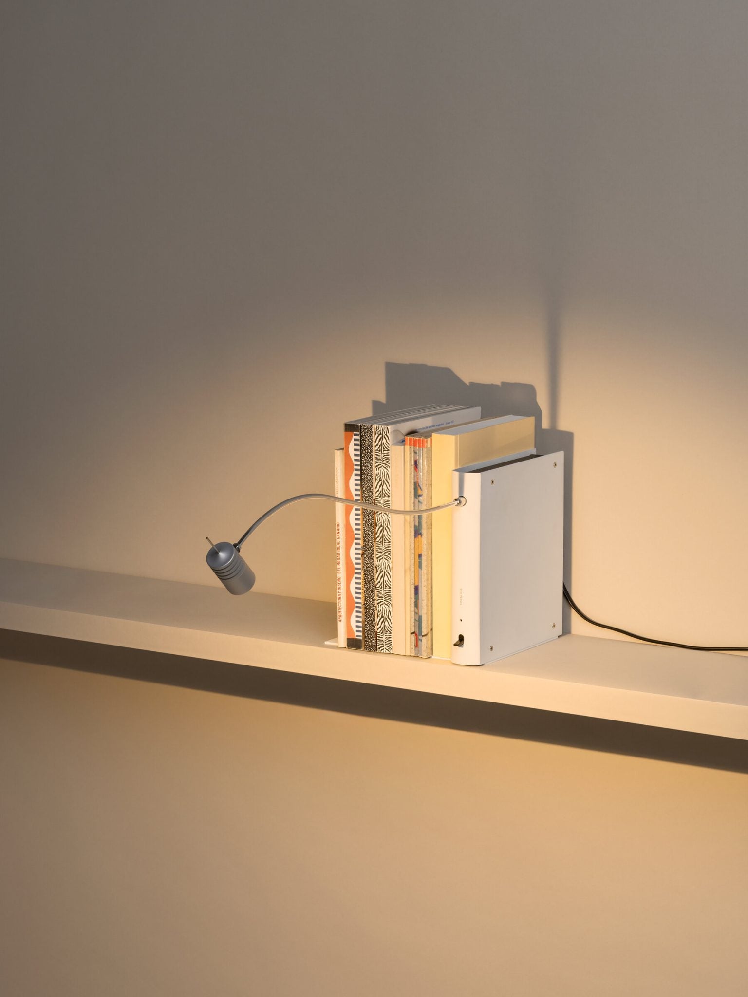 Conceived in 1986, the Bib Luz's book-shaped metallic body nestles among your books. A slender, adjustable arm extends to a spotlight, directing light precisely. This acclaimed design features enhanced LED technology for superior performance.
