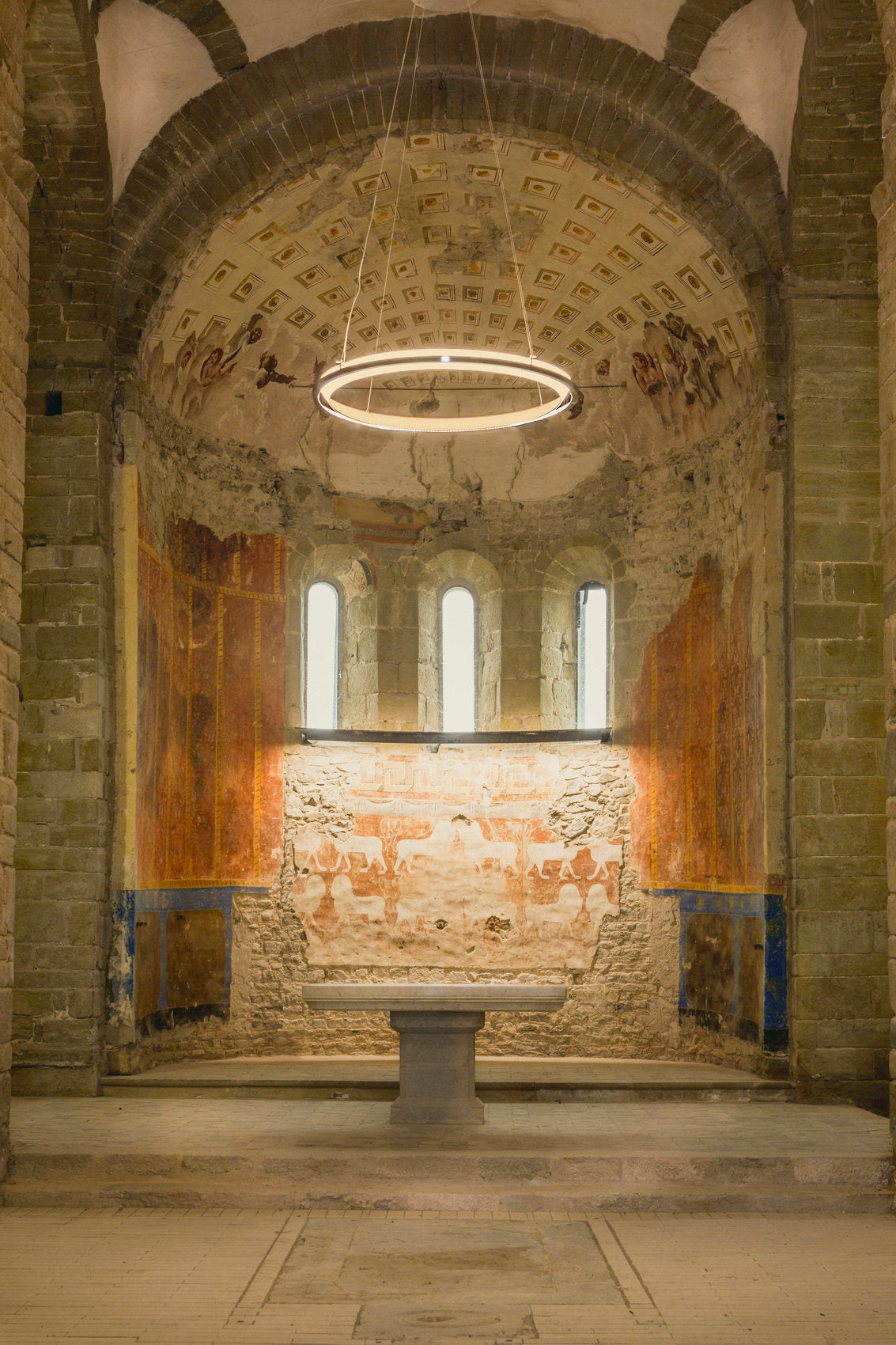 Nimba is the first lamp designed by Antoni Arola at the end of the 90s, as one of the first luminous halos on the market. It is a floating ring formed by a metal profile, and an inner shade that diffuses the light. The lamp's name is inspired by "the nimbus or halo around holy images, which can be seen, but is not there". Nimba shines light on the center of nowhere to radiate out in all directions. Used as a single unit or in sequence, Nimba provides the perfect amount of soft light to create a mythical atmosphere, suitable for both transit spaces and secluded areas. The family features four LED lamp models in different diameters, seamlessly fusing simplicity and high-technology