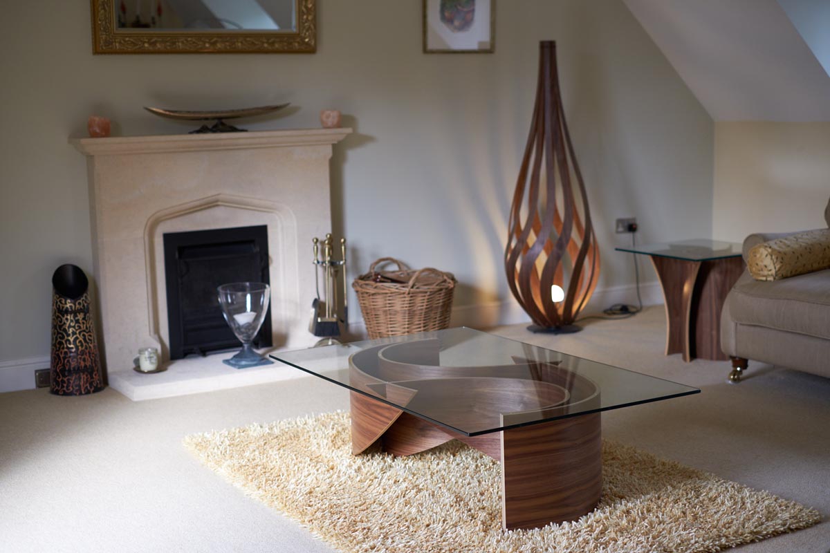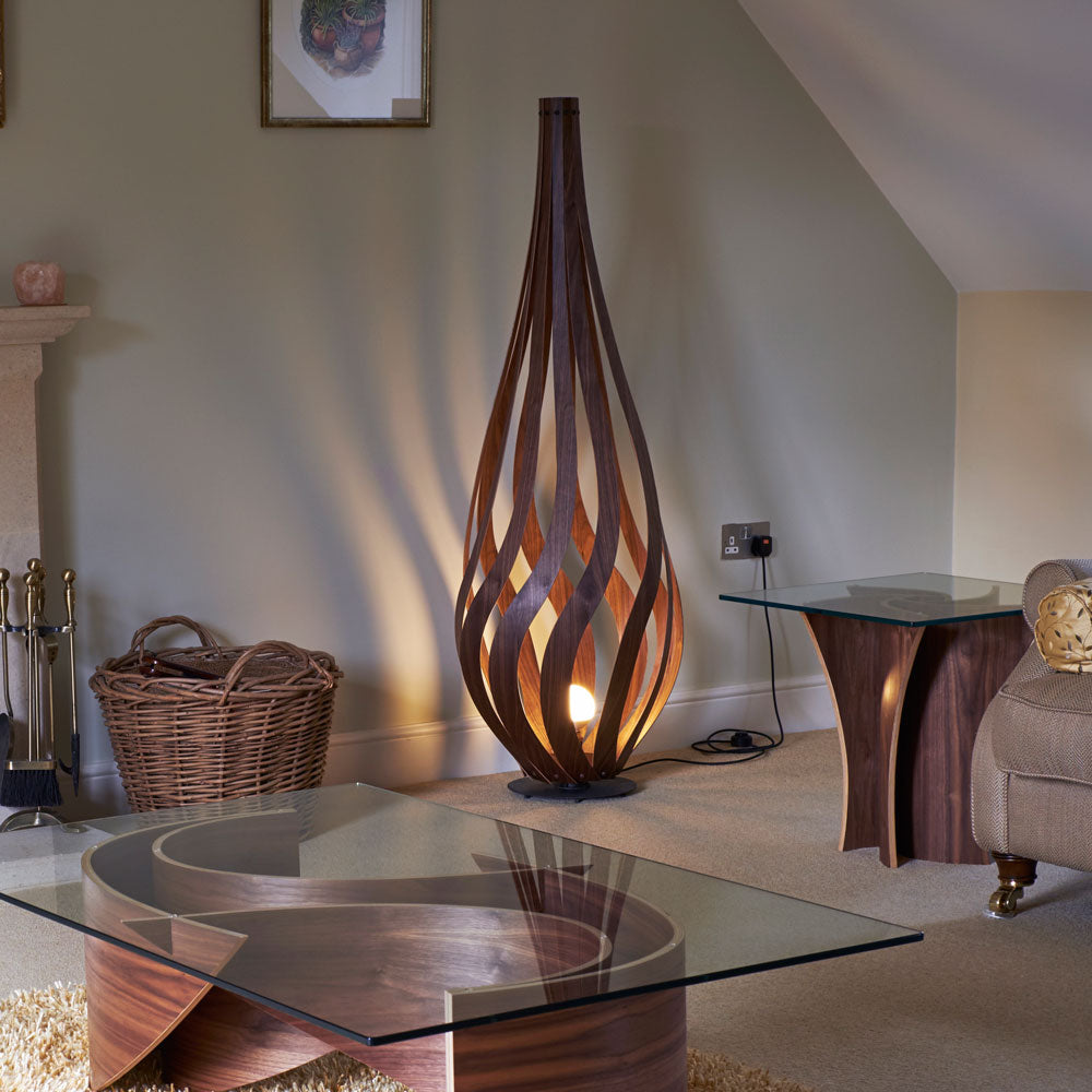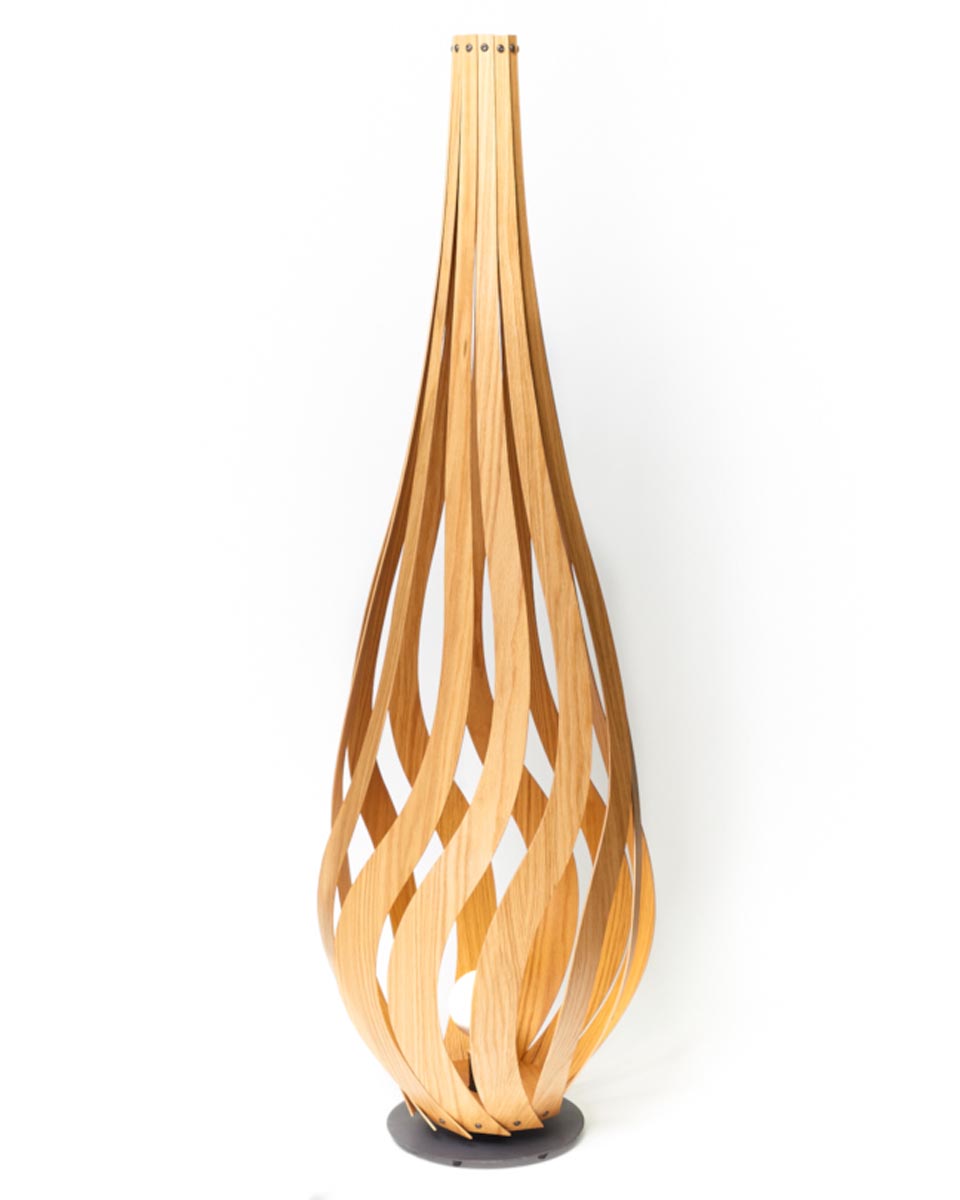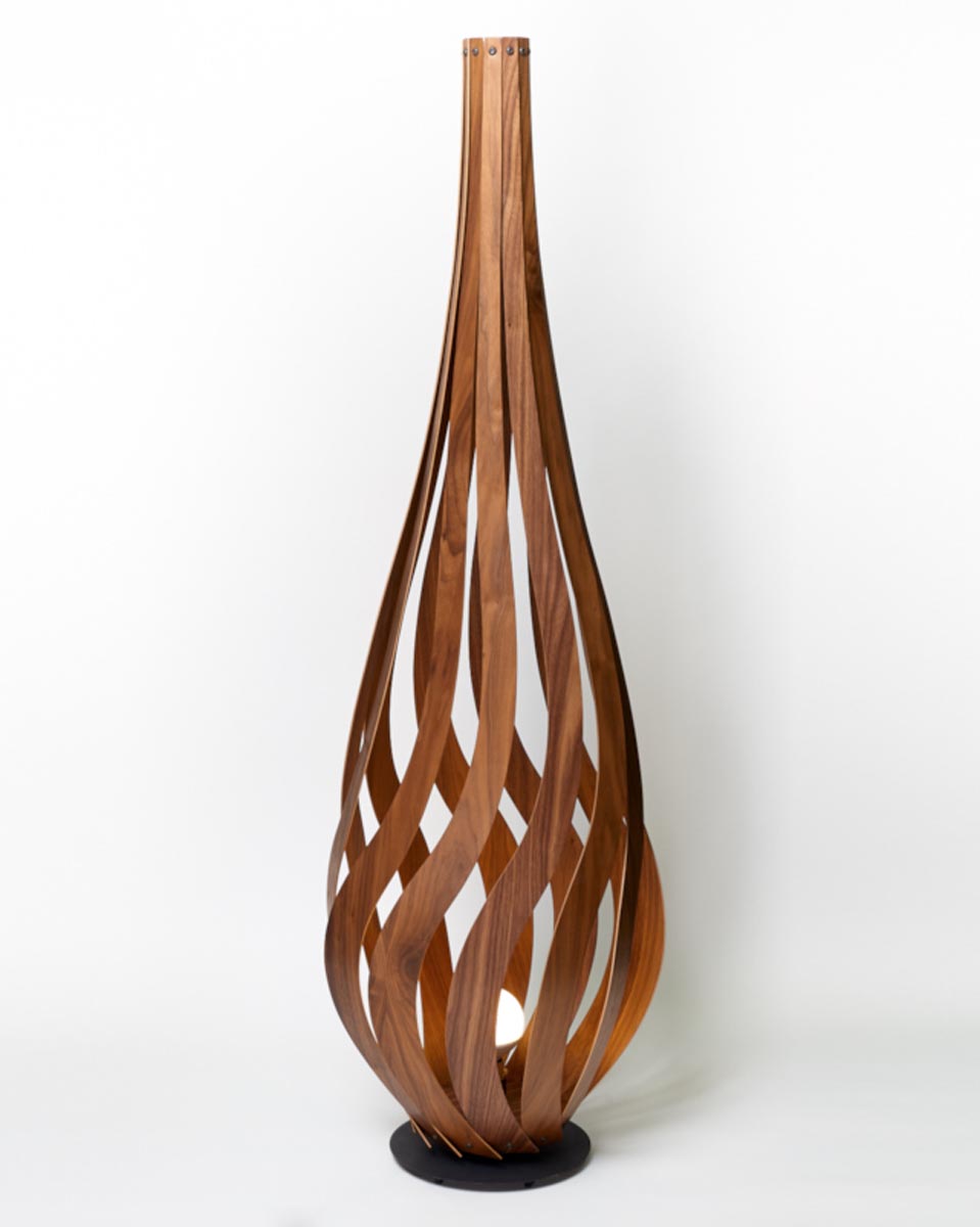 Discover the enchanting Tulip Floor Lamp, crafted by MacMaster Design. With its gracefully spiraling wood curves, this lamp emanates a warm, inviting glow, available in a range of exquisite finishes.