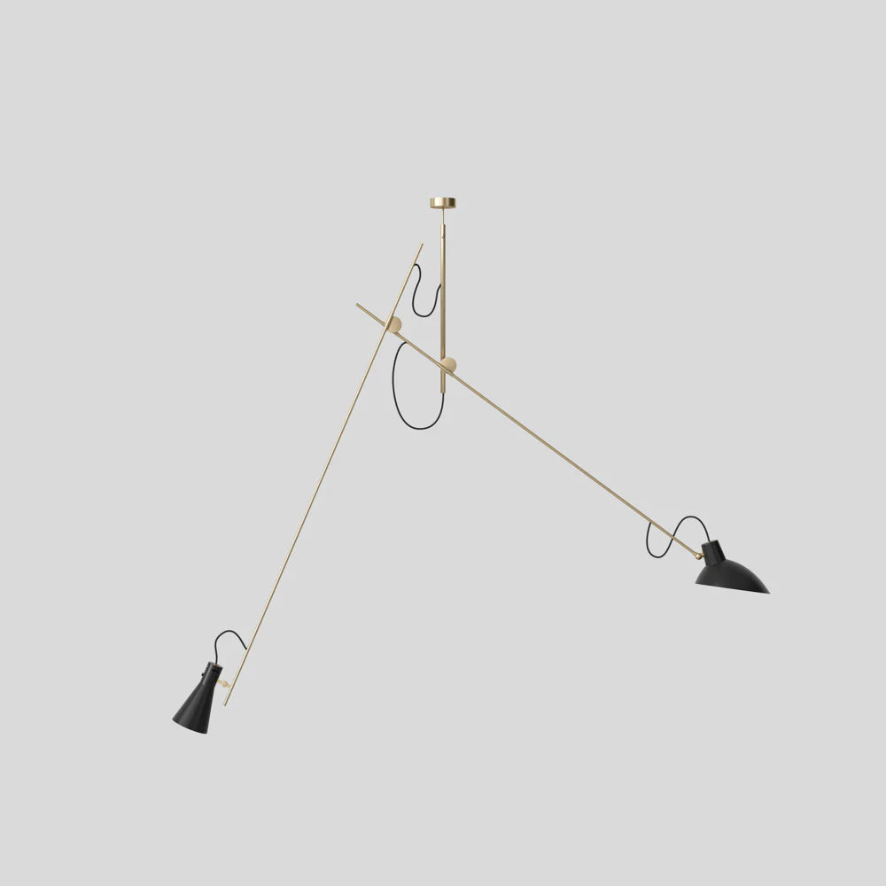The VV Cinquanta Suspension is elegant and versatile with two posable direct light sources. With a distinctive dual-stemmed construction, it is a type of kinetic object constructed to take advantage of the principle of equilibrium. Therefore the central pole might find its equilibrium in a way which is not perpendicular to the ceiling. The fixture and the reflectors can be adjusted to many different positions, enabling a wide variety of both downward and upward lighting at the same time. The invitingly playful design encourages dynamic lighting compositions. The VV Cinquanta reflectors are made of enameled spun aluminium, available in original Vittoriano Viganò colors.